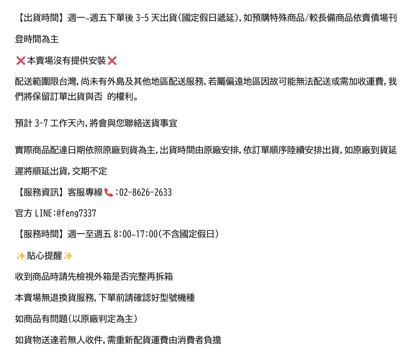★服務區域: 桃園以北無需另收運費, 新竹以北地區,需收取跨區費,中南部無安裝及運送服務