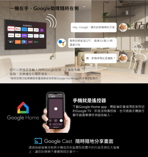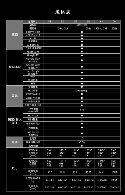 ★服務區域: 桃園以北無需另收運費, 新竹以北地區,需收取跨區費,中南部無安裝及運送服務 ♦本賣場價格未含壁掛架,如需安裝費用另計。 ● 4K UHD 3840×2160 高解析度 ● Google TV 3.0 智慧系統 ● 內建15W+15W 四單體喇叭 ● 支援120Hz DLG 高更新率 ● Dolby Audio / Dolby Atmos / Dolby Vision ● 內建4組HDMI / 2組USB端子