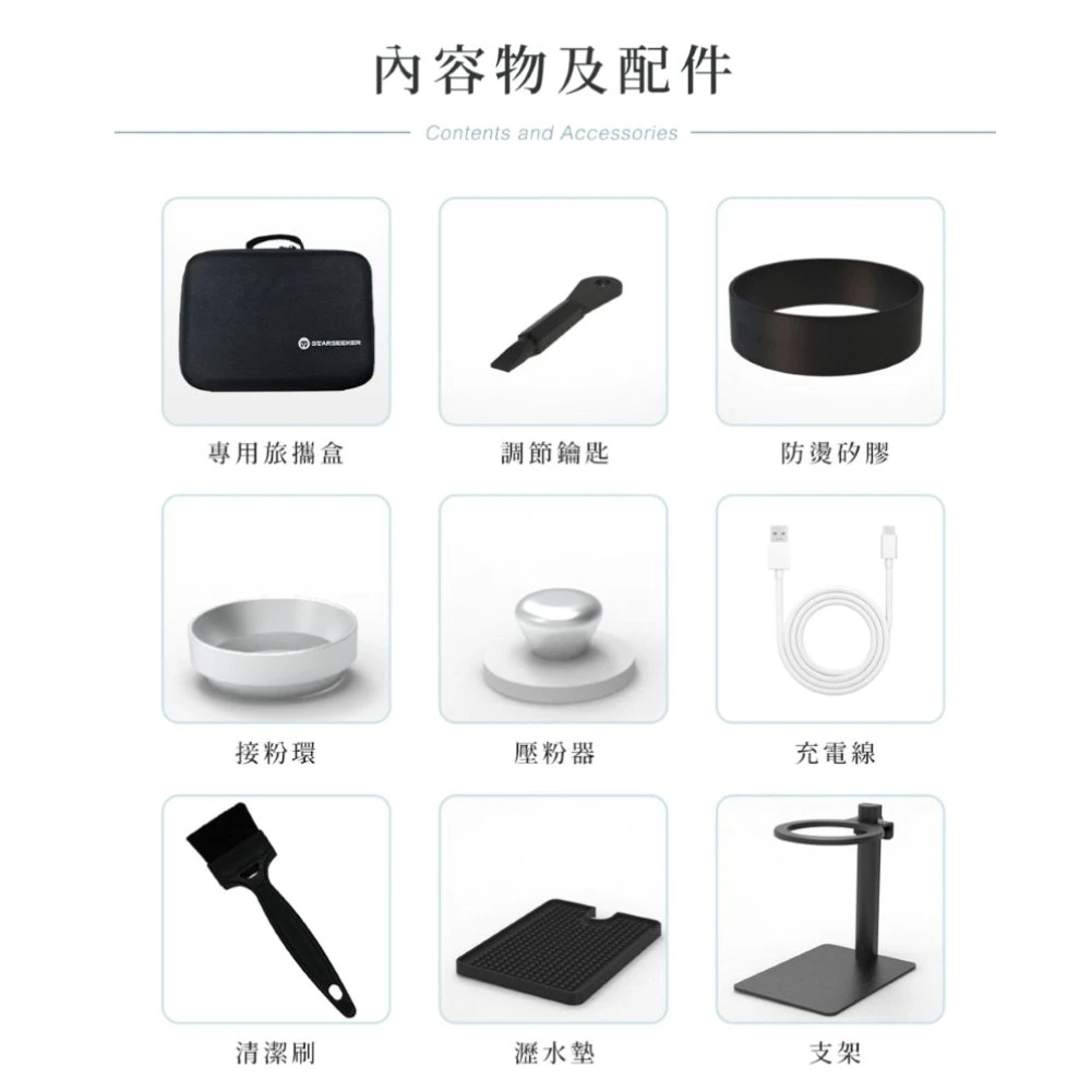 - :配件:主機,防燙杯(旋轉杯),專用旅攜盒,調節鑰匙,防燙矽膠圈,接粉環,壓粉器,充電線,清潔刷,瀝水墊,專用支架,說明書