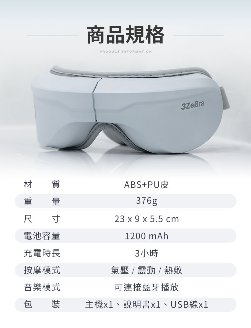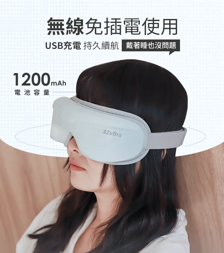 【3Zebra】5C熱敷音樂按摩眼罩 ~氣壓+震動+熱敷,三種功能一次滿足 ~ 仿真人揉捏手法 ~ 智能溫控,安全放心,簡單操作,隨時隨地熱敷 ~ 曲面遮光,穩固不滑落,特殊加長設計 ~ 更貼合按摩到眼部穴道 ~ 可180度折疊,方便好攜帶 ~ 可連結手機藍芽播放音樂