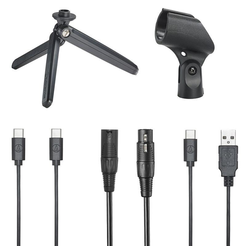 5/8"-27螺紋麥克風夾、三腳支架、2.0m USB-C-USB-C連接線(USB On-The-Go相容)、 2.0m USB-C to A連接線、3.0mXLRF-XLRM連接線