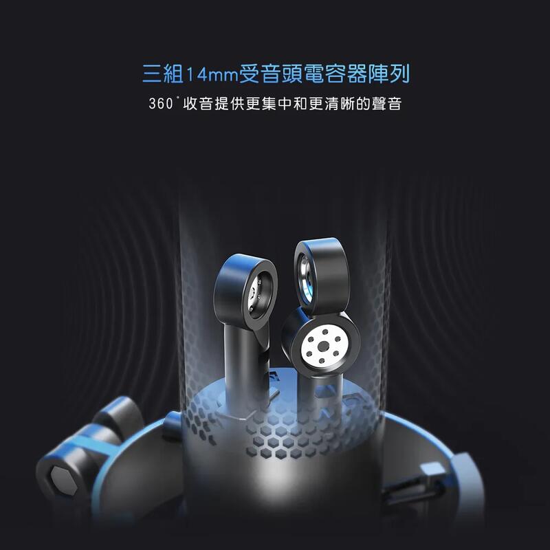 三組14mm受音頭電容器陣列,360°收音提供更集中和更清晰的聲音。