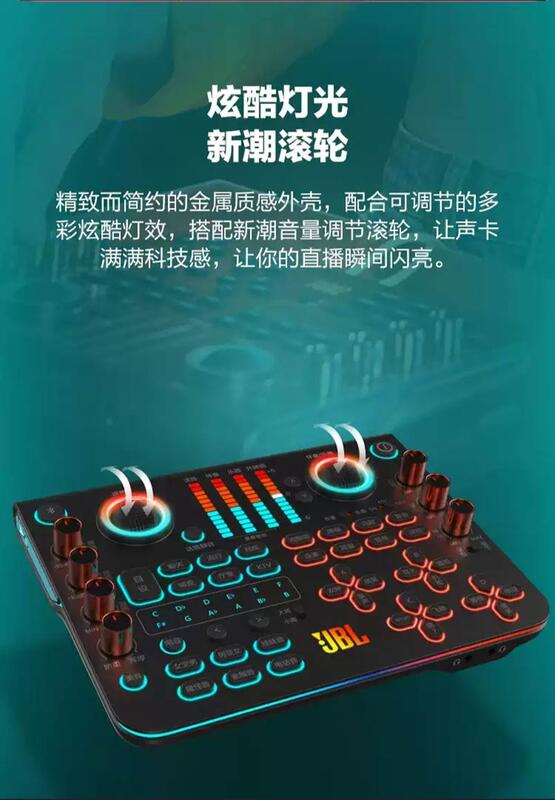 可使用動圈式咪和任何電容咪使用!超輕型金屬外殼,Led圍邊燈光效果,超時尚調節滾輪或音量,led顯示大小音量,可外接有源音箱 雙手機直播或雙手機錄音,支援藍牙無線伴奏,約5小時電量特長使用時間。