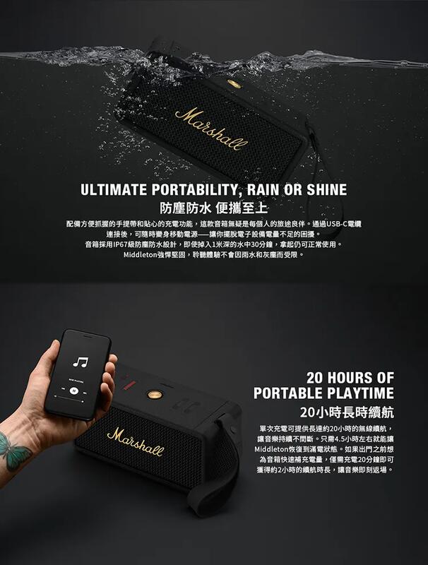 Middleton隨身便攜,渾厚音質一路同行。採用四揚聲器配置,隨行之處,都能獲得沉浸式的聆聽體驗。