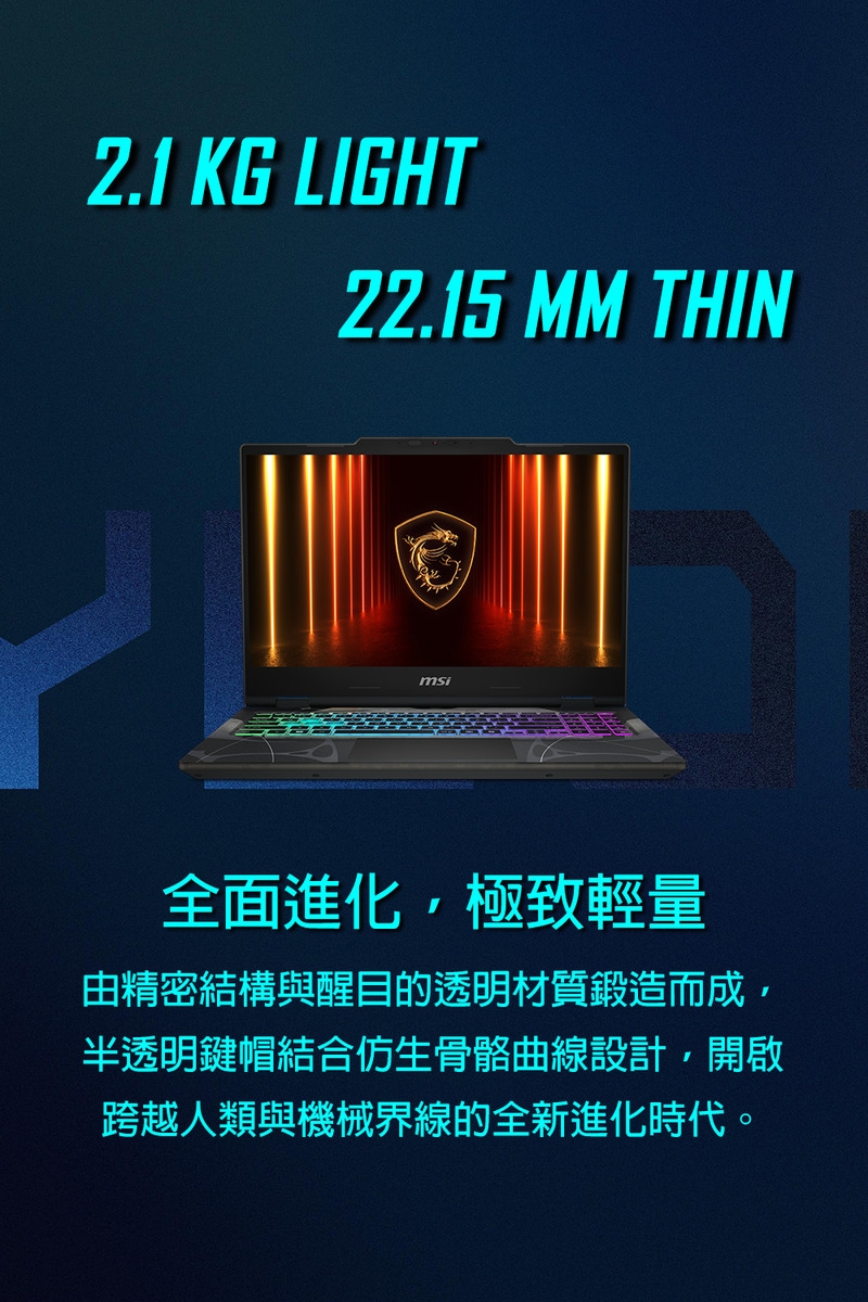 Intel Core 7處理器 RTX5060 8G獨顯 15.6吋高畫質144HZ 獨特半透明鍵帽設計WASD熱鍵 穿透感半透明設計