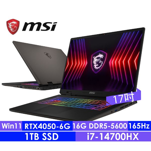 Intel 14代 i7處理器 搭載RTX4050 6G獨顯 17吋FHD+解析165HZ 24區RGB全彩背光電競鍵盤 支援播放高解析音樂