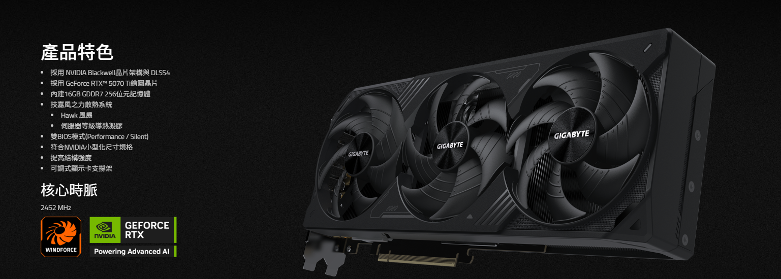 技嘉 RTX5070Ti WINDFORCE SFF 16G(2452MHz/31cm/三風扇)