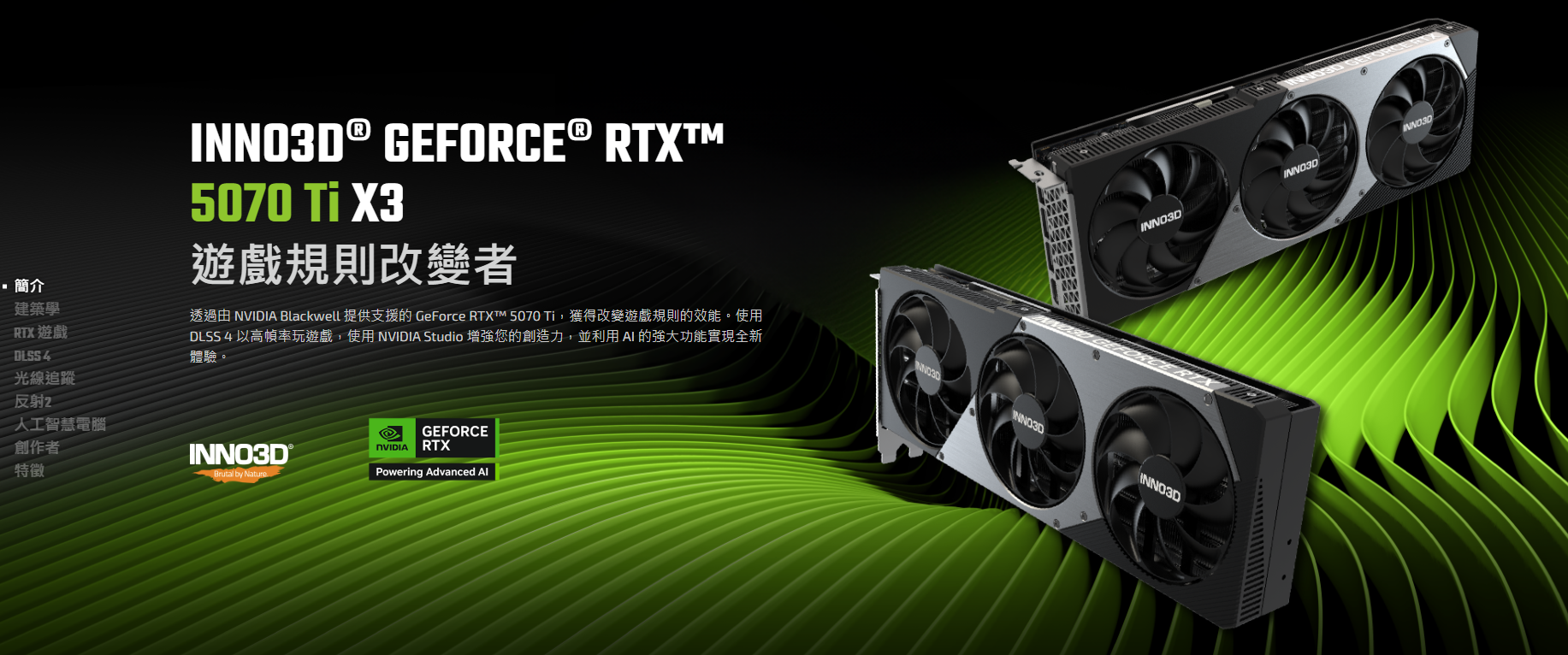 INNO3D GeForce RTX 5070 Ti X3 OC 預示著圖形技術的新時代,這些 GPU 為效能樹立了新的標竿。 X3 OC 超越了原始動力,採用令人驚嘆的重新設計,將外形和功能完美地融合在一起。這種美學與尖端技術的完美融合使INNO3D贏得了廣泛讚譽,鞏固了其作為圖形創新先驅的地位。