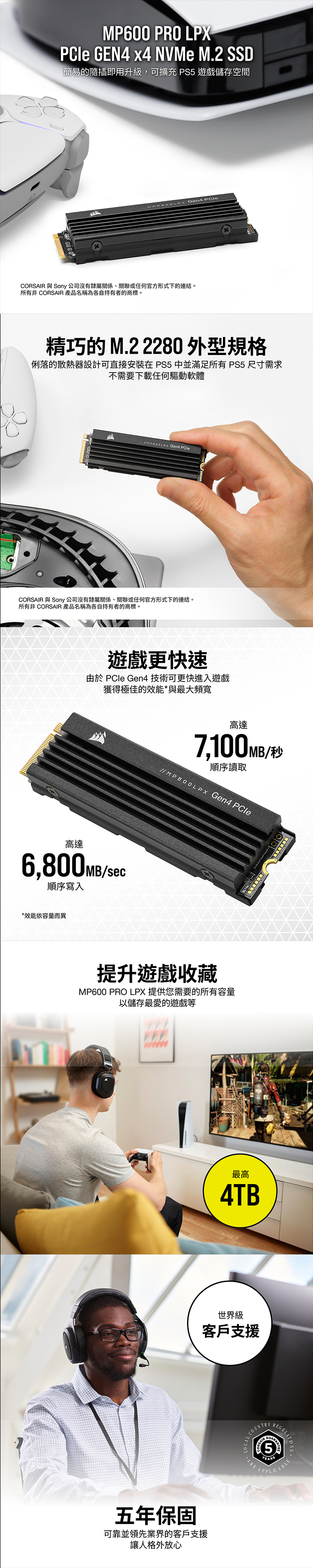 讀取最高7100MB/sec,寫入最高5800MB/sec 兼容PS5 五年保