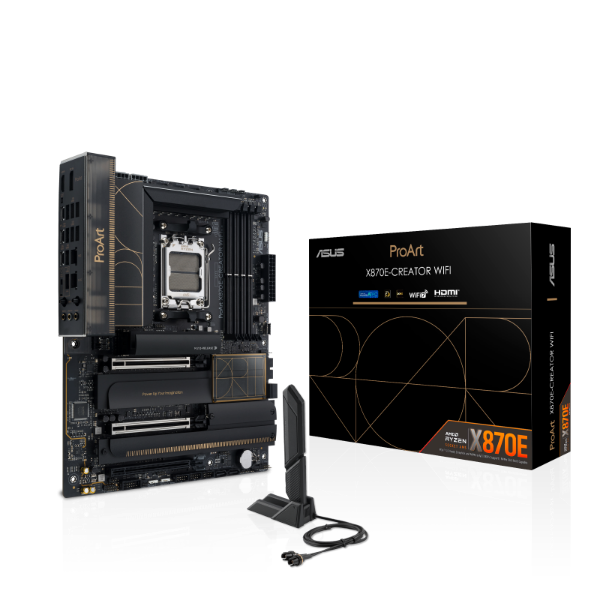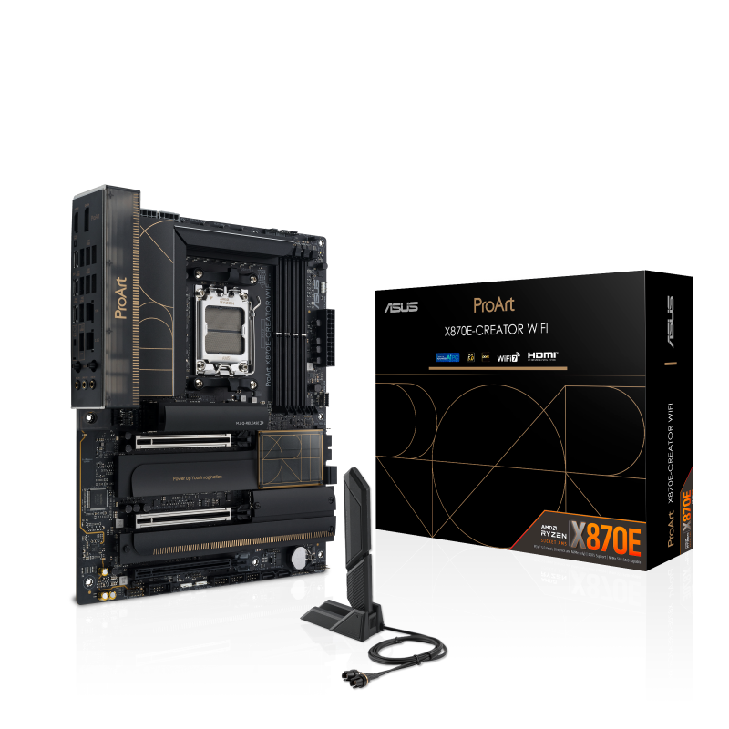 ✦ ProArt X870E-Creator WiFi 具備 16+2+2 整合式功率級、DDR5 和 PCIe 5.0,以及雙 USB4®、10 Gb 和 2.5 Gb 乙太網路以及 WiFi 7 等超快連線速度,充分發揮最新 AMD Ryzen™ 9000/8000/7000 系列處理器的效能,為各種程度的創作者帶來強大助力。 ✦ 此主機板體現了各種內容創作者追求專業、優雅和精準的願景,並由同色系的黑色層次與金色金屬元素相映成輝,使獨特風格更臻完美。半透明的 I/O 外蓋造型時尚,還可讓使用者一窺內部的頂級連接器。