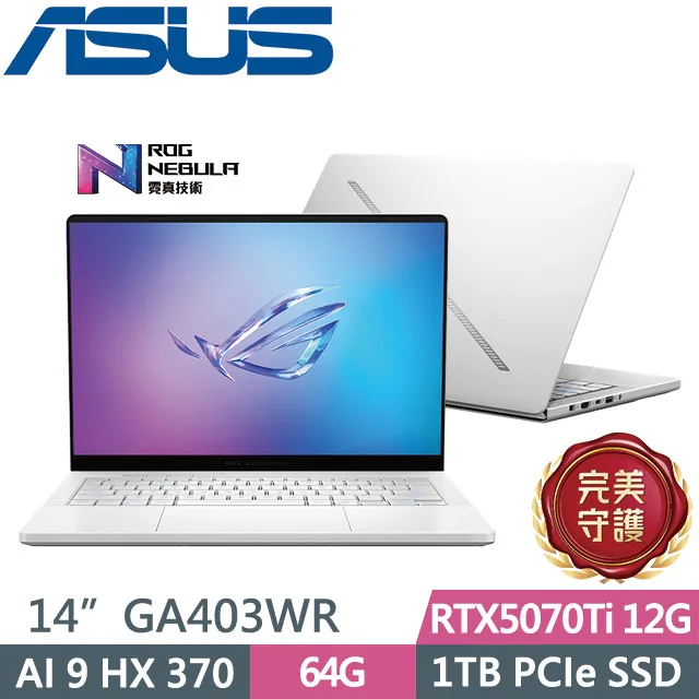 ●型號:GA403WR-0058HHX370-NBLO 鉑月銀(有燈效/單區RGB) (ROG Zephyrus G14) ●主螢幕尺寸:14" 3K (2880 x 1800) OLED 16:10 aspect ratio , 120Hz , DCI-P3 100% , Glossy display , ROG Nebula Display , 通過PANTONE認證 , Dolby Vision HDR , G-Sync , Adaptive-Sync ●處理器:AMD Ryzen AI 9 HX 370 Processor 2.0GHz (36MB Cache, up to 5.1GHz, 12 cores, 24 Threads) AMD XDNA NPU up to 50TOPS ●記憶體:64GB LPDDR5X 8000 on board(Max.64GB) ●硬碟:1TB PCIe 4.0 NVMe M.2 SSD ●光碟機:無 ●顯示卡:NVIDIA GeForce RTX 5070 Ti Laptop GPU 12GB GDDR7(具備MUX獨顯直連)   ●作業系統:Windows 11 Home ●藍芽:Bluetooth 5.4 Wireless Card ●無線規格:Wi-Fi 7(802.11be) (Triple band) 2*2 ●視訊攝影機:1080P FHD IR Camera for Windows Hello ●其他:Backlit Chiclet Keyboard 1-Zone RGB With Copilot key ●連接埠: 1x Type-C USB 4 with support for DisplayPort / power delivery (data speed up to 40Gbps) 1x USB 3.2 Gen 2 Type-C with support for DisplayPort / power delivery / G-SYNC (data speed up to 10Gbps) 2x USB 3.2 Gen 2 Type-A (data speed up to 10Gbps) 1x card reader (microSD) (UHS-II) 1x 3.5mm Combo Audio Jack 1x HDMI 2.1 FRL ●箱內含:ROG Zephyrus G14 保護套 (2024)、ROG Impact Gaming Mouse ●尺寸:31.1 x 22.0 x 1.59 ~ 1.83 cm ●重量:1.57kg(含電池) ●電池:73WHrs, 4S1P, 4-cell Li-ion ●保固:兩年國際保固/首年完美保固 ●BSMI商檢字號:R31018 ●備註:以上規格僅供參考,如有任何問題,請依原廠公告為主