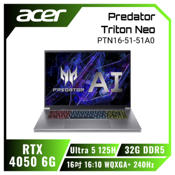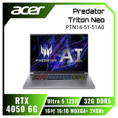 Acer Triton Neo /Ultra 5-125H/RTX4050/32G/512G/16吋/銀 PTN16-51-51A0