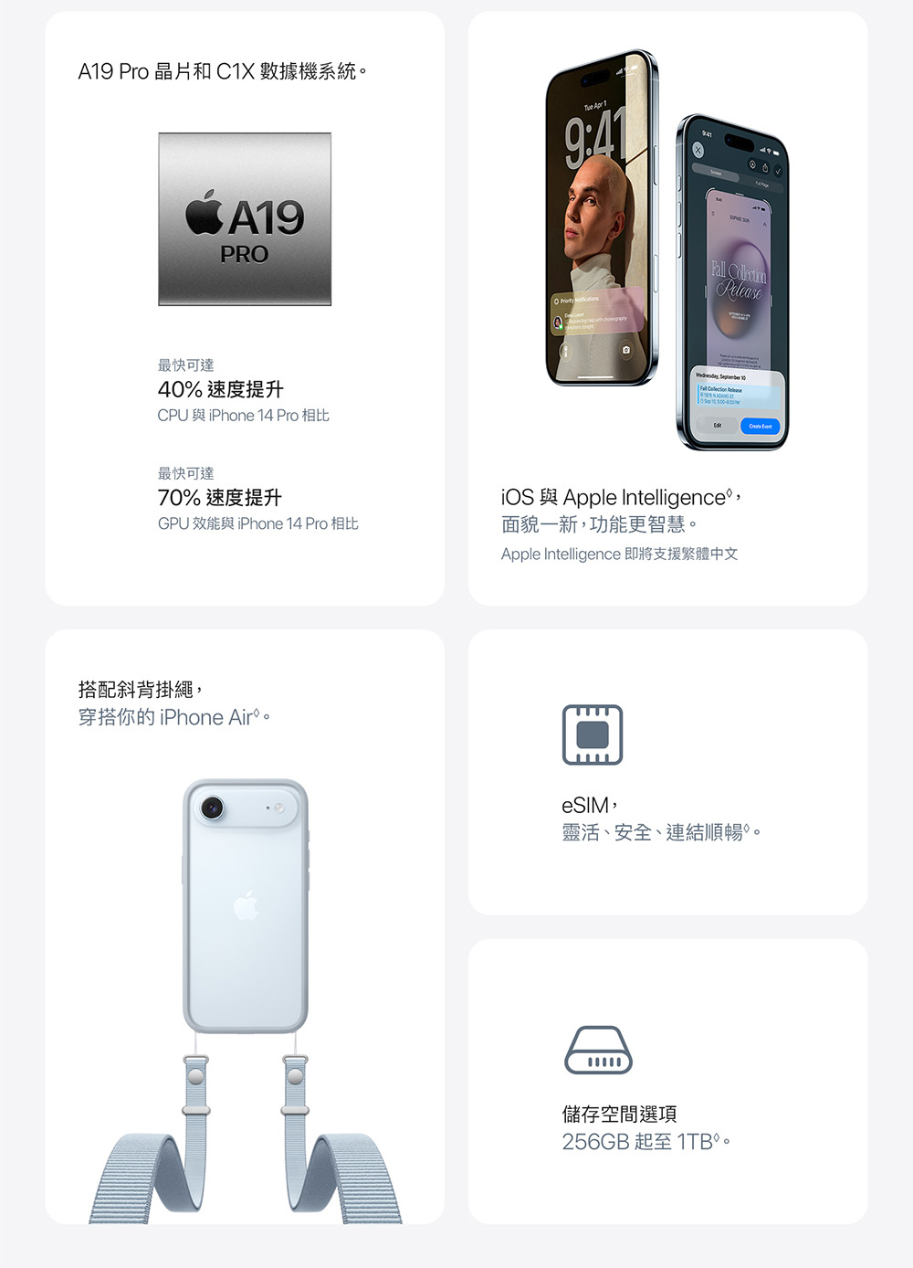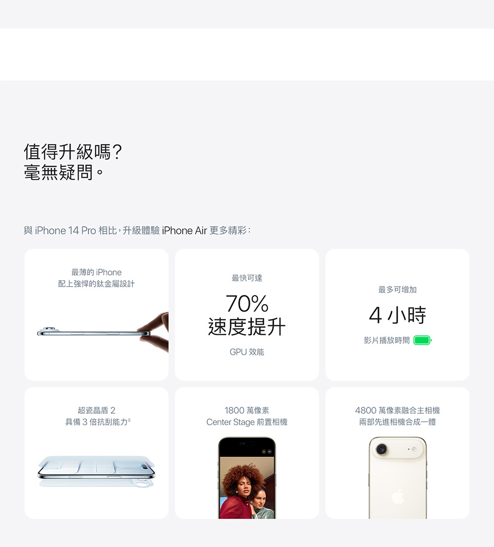 ▪ 薄至 5.6 公釐、輕僅 165 公克,史上最薄 iPhone ▪ A19 Pro 飛速效能,駕馭你的日常工作流程