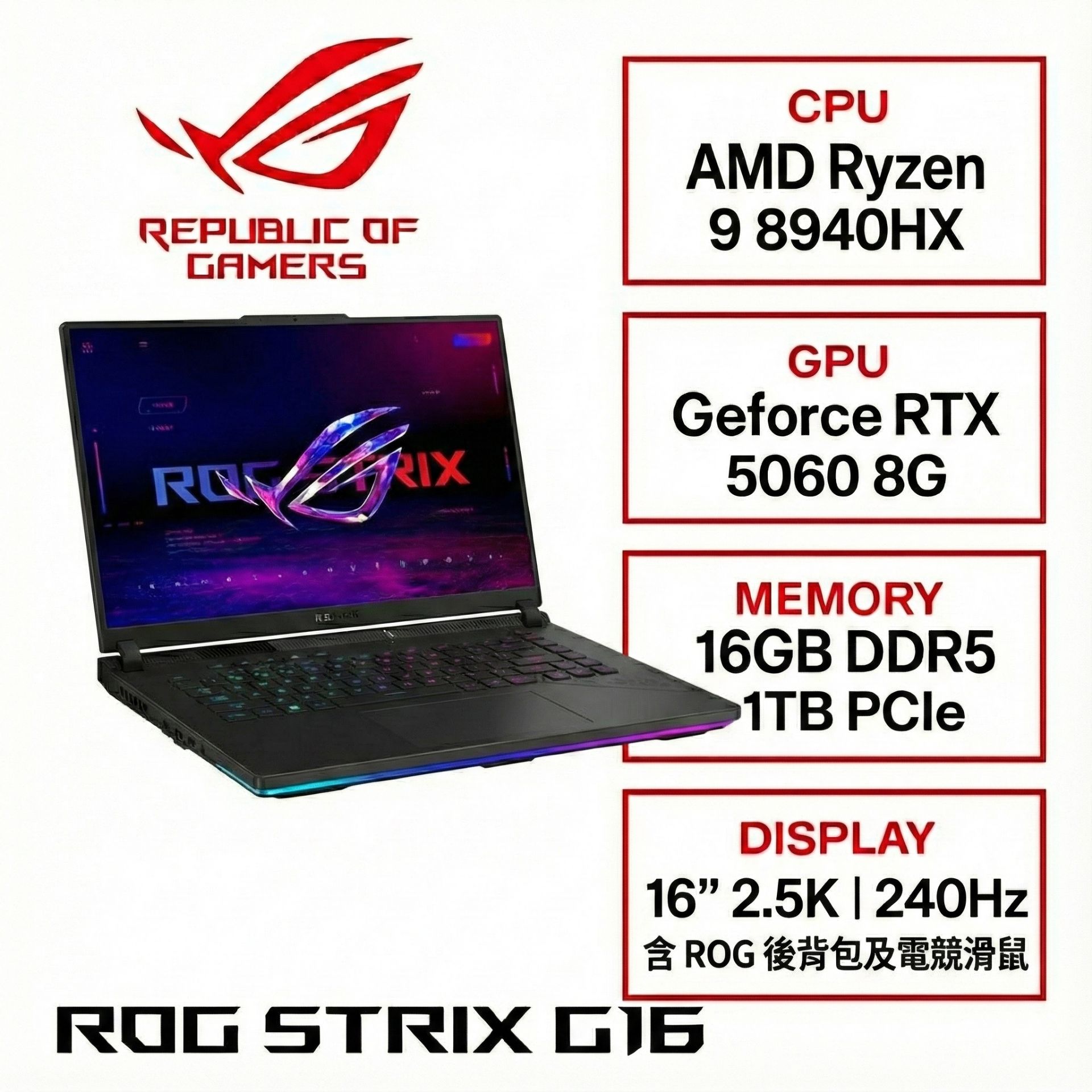 ASUS ROG Strix G16 G614PM-0024C8940HX-NBL 幻潮黑 華碩經典潮流電競筆電/R9-8940HX/RTX5060 8G/16GB DDR5/1TB PCIe/16吋 16:10 2.5K 240Hz/W11/含ROG後背包及電競滑鼠🎈送保護套/滑鼠墊/鍵盤膜🎈