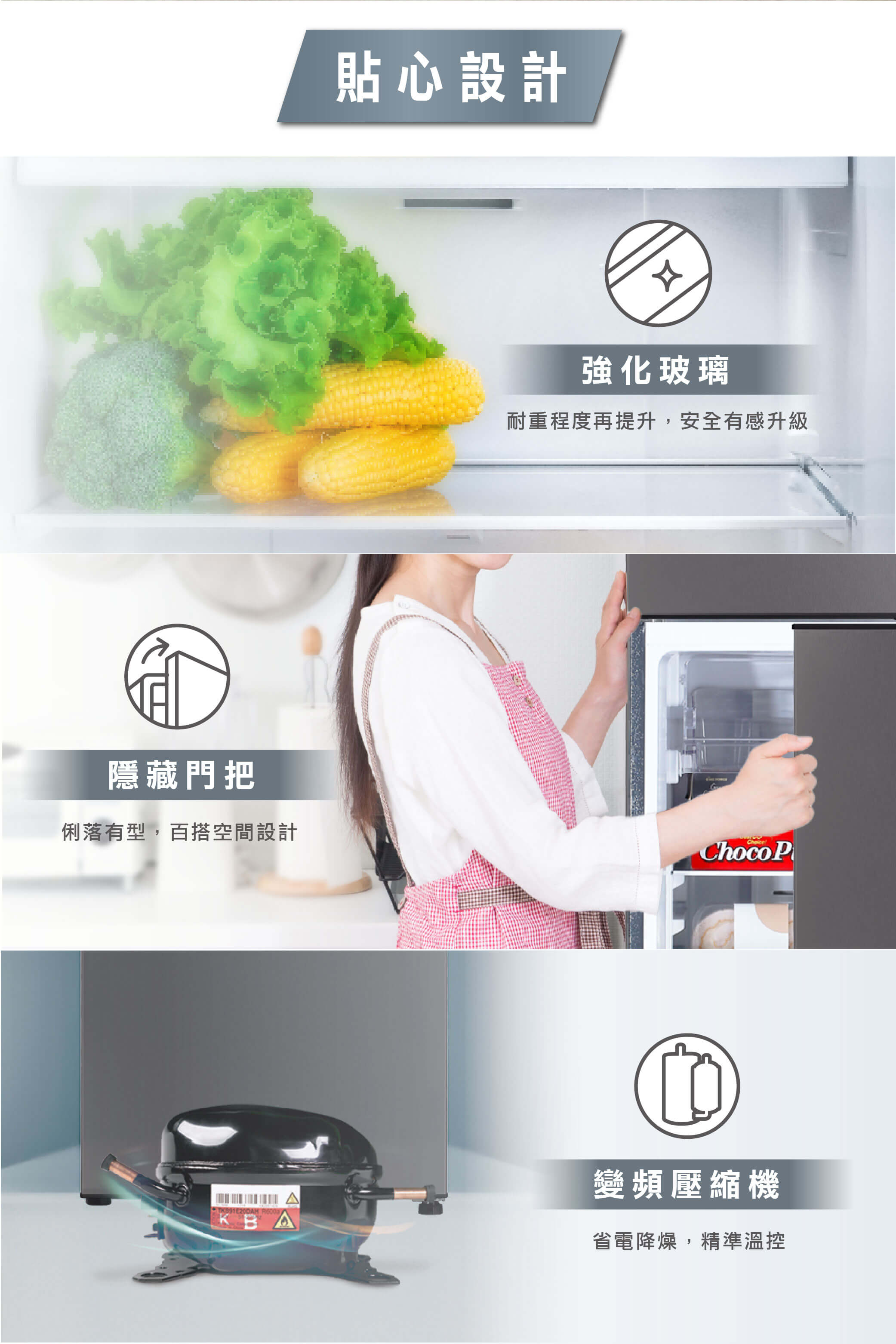 ● 高級晶鑽安全強化玻璃棚架 ● 高效節能一級變頻壓縮機 ● 奈米鐵+Ag+雙效抑菌脫臭
