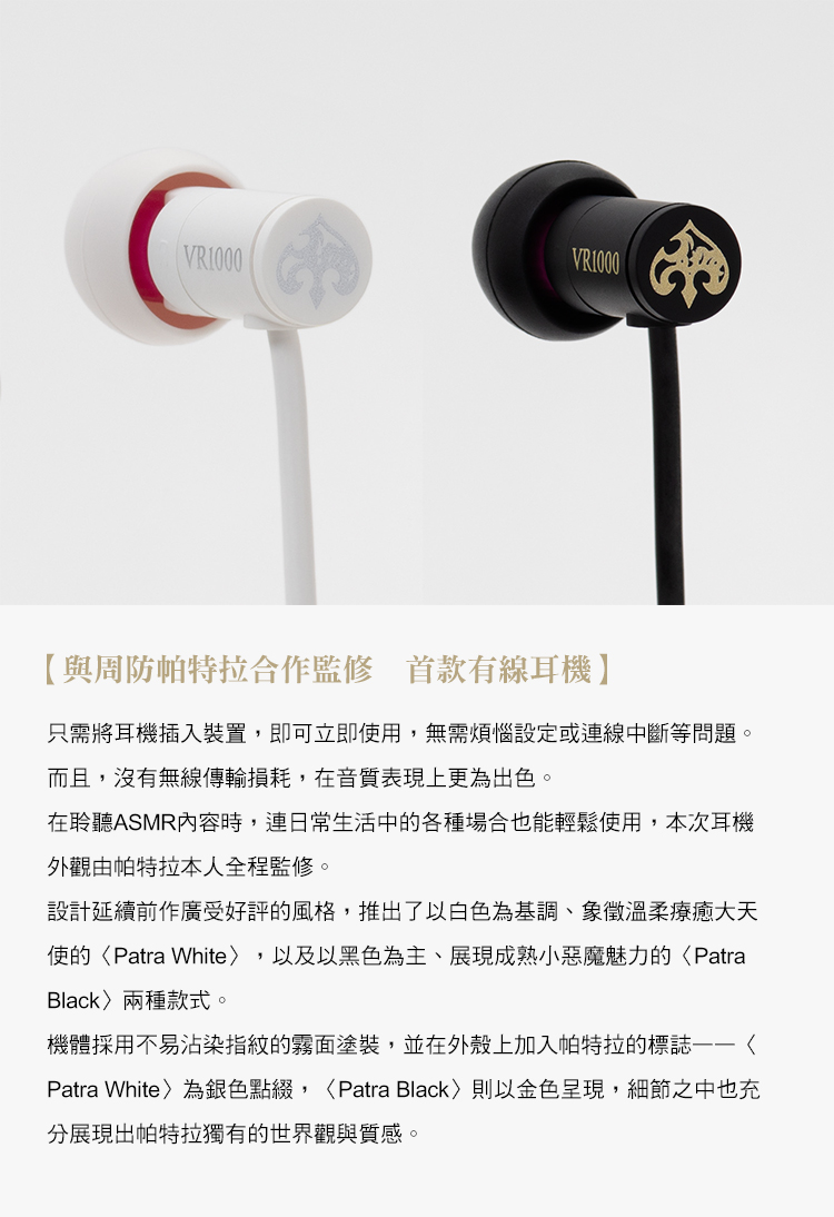 超人氣VTuber「周防帕特拉」推出與final聯名的第四彈商品「VR1000 for ASMR Patra White/Patra Black」,是專為帕特拉的ASMR作品打造的首款有線耳機,加入final的音質設計以及兩款帕特拉原創外觀:溫柔療癒的大天使〈Patra White〉&成熟魅惑的小惡魔〈Patra Black〉。