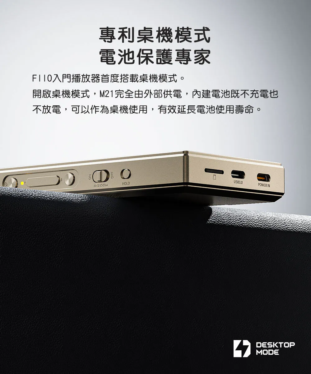 FIIO入門播放器首度搭載桌機模式。開啟桌機模式,M21完全由外部供電,內建電池既不充電也不放電,可以作為桌機使用,有效延長電池使用壽命。