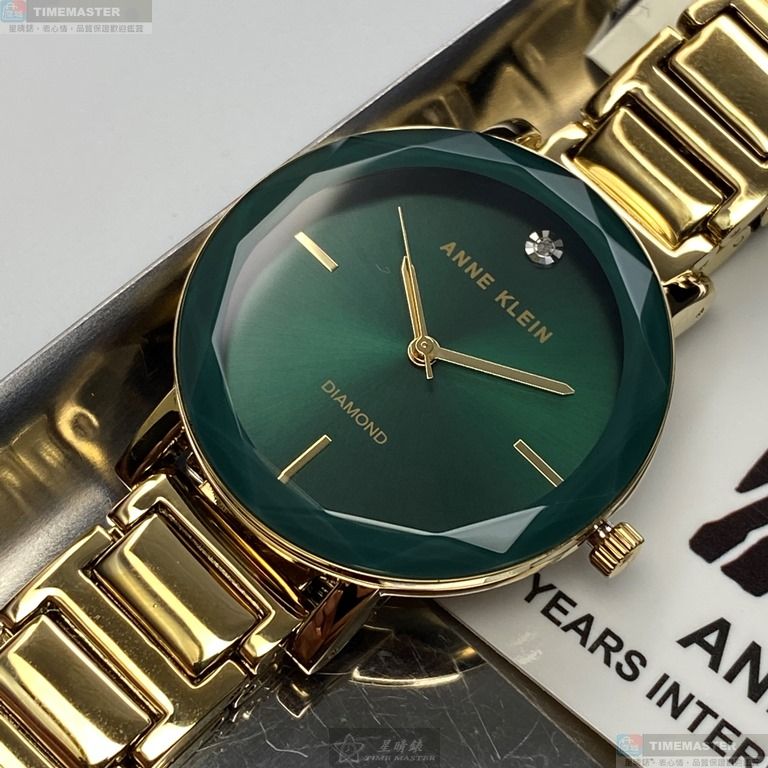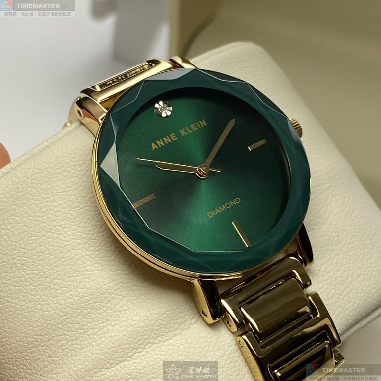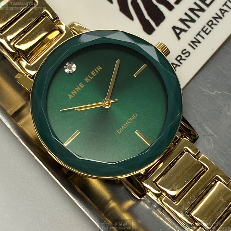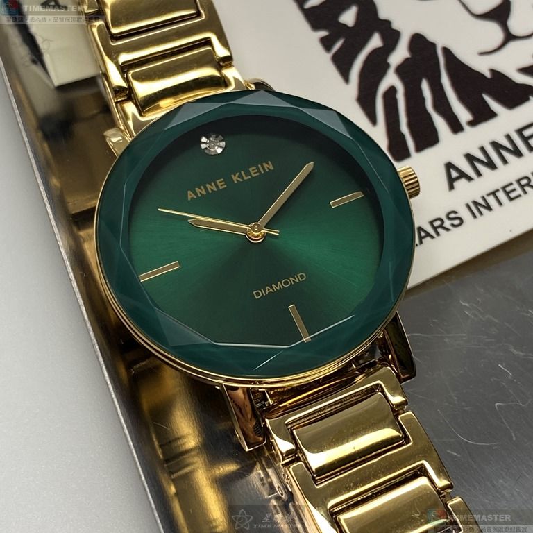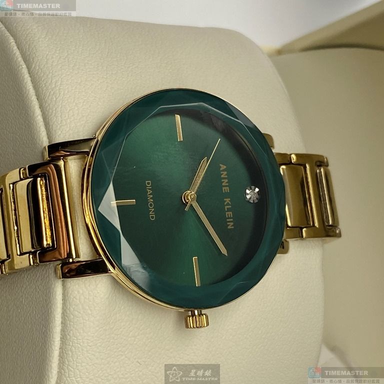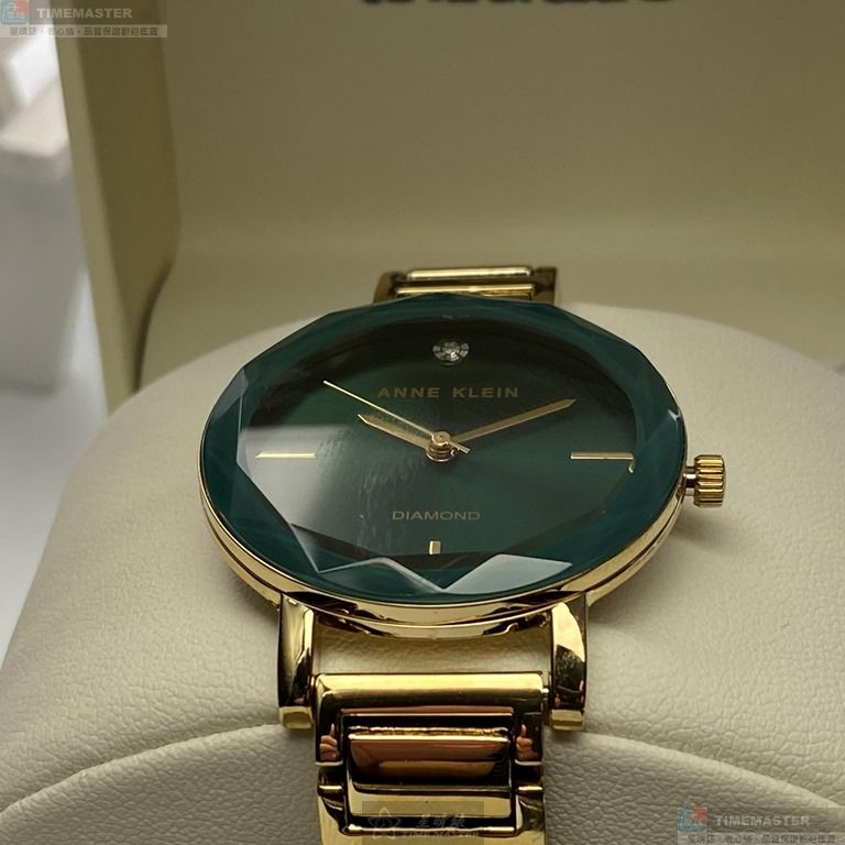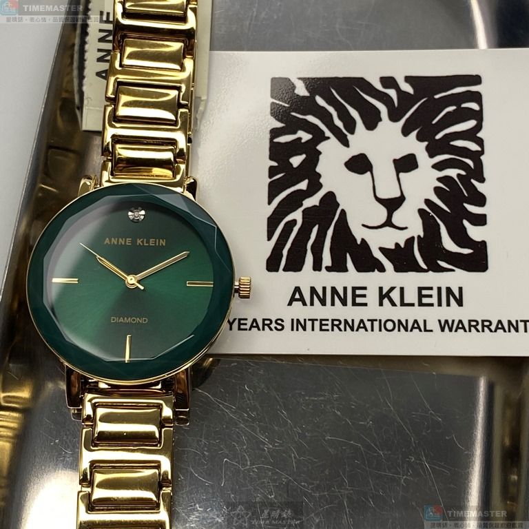 AnneKlein手錶,編號AN00361,26mm金色圓形精鋼錶殼,藍綠簡約錶面,金色合金錶帶款,最新廣告款!