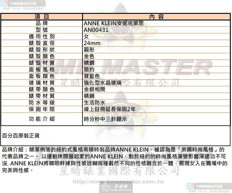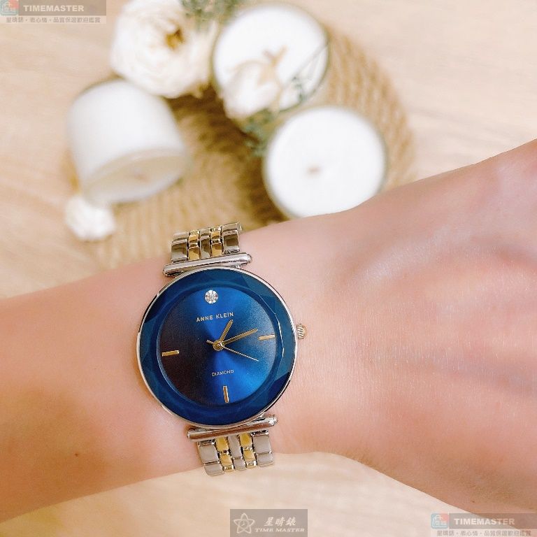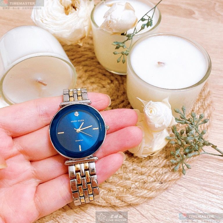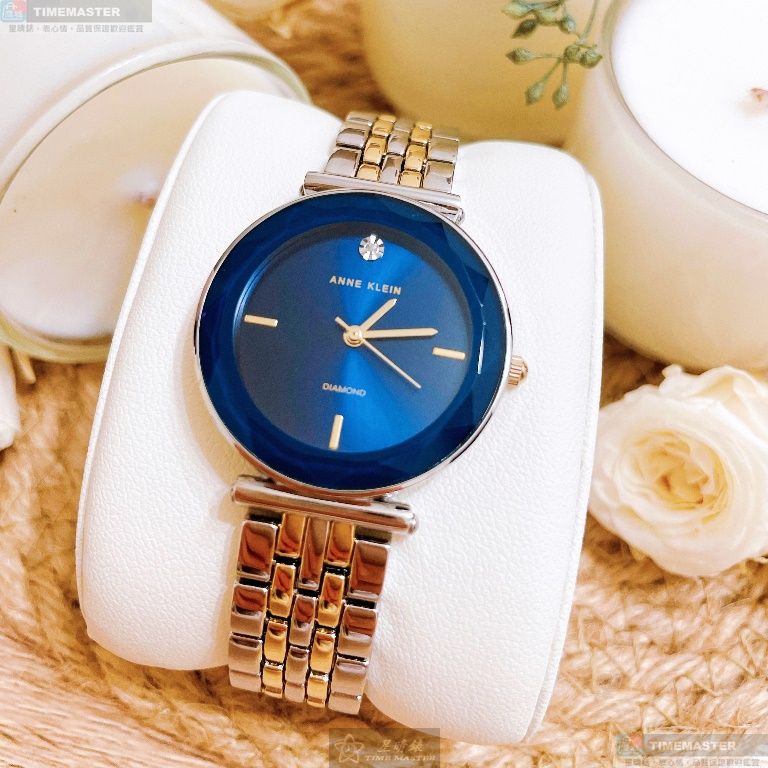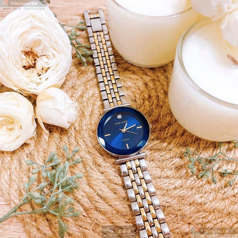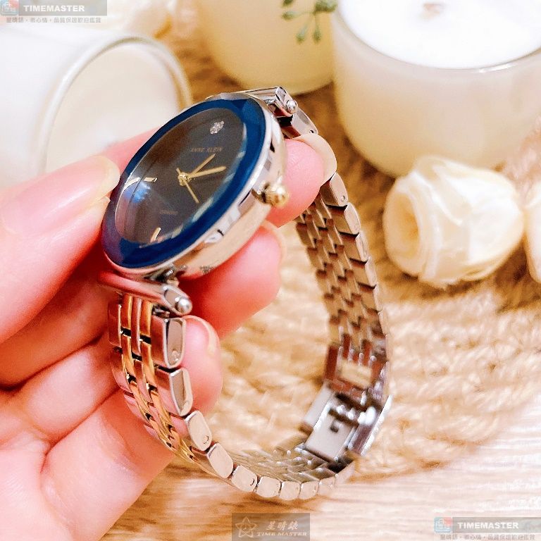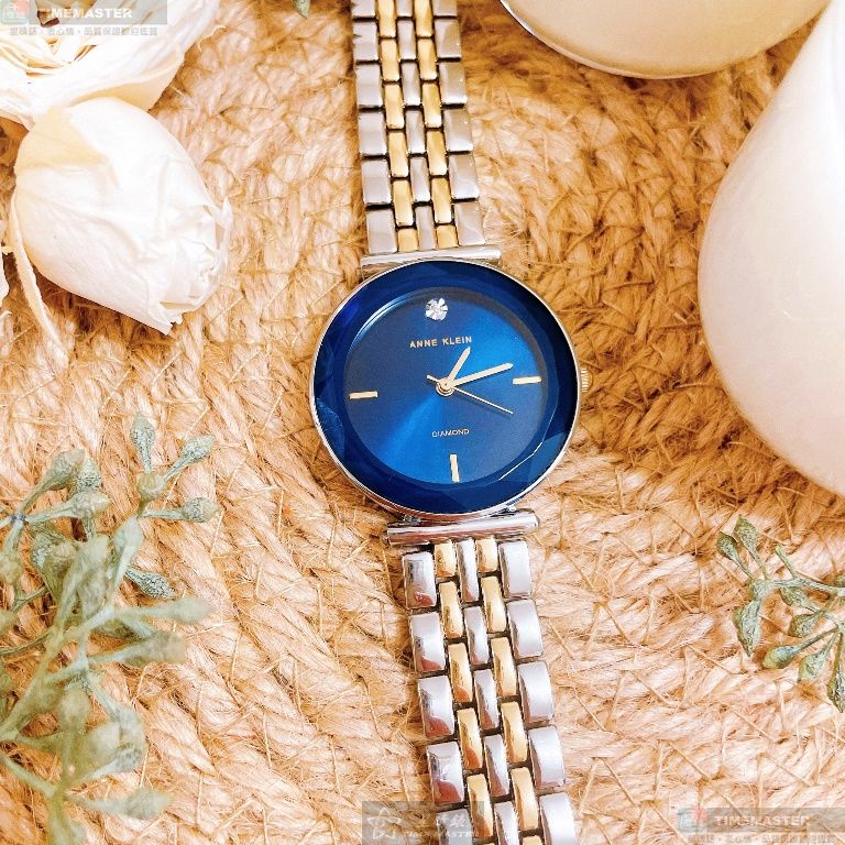 AnneKlein手錶,編號AN00431,24mm金色圓形精鋼錶殼,寶藍色簡約錶面,金銀相間精鋼錶帶款