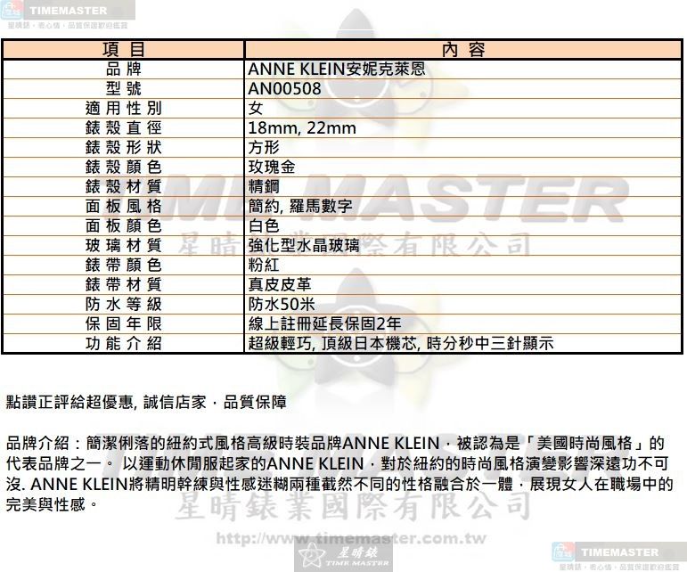 AnneKlein手錶,編號AN00508,18mm, 22mm玫瑰金錶殼,粉紅錶帶款
