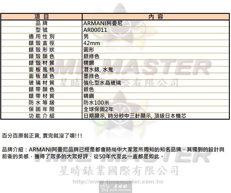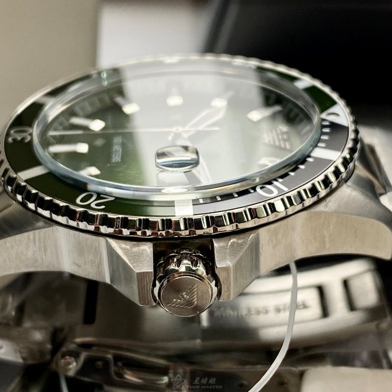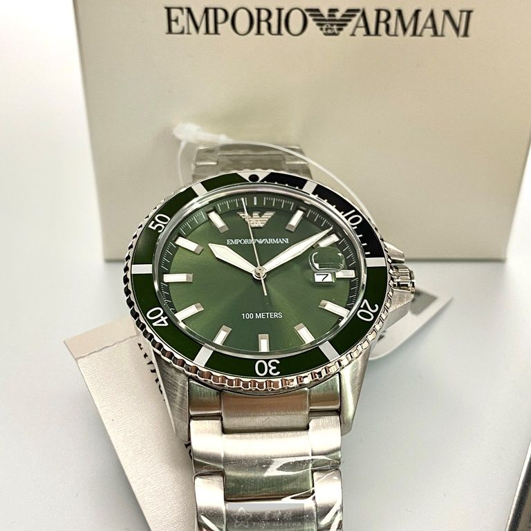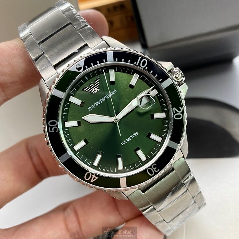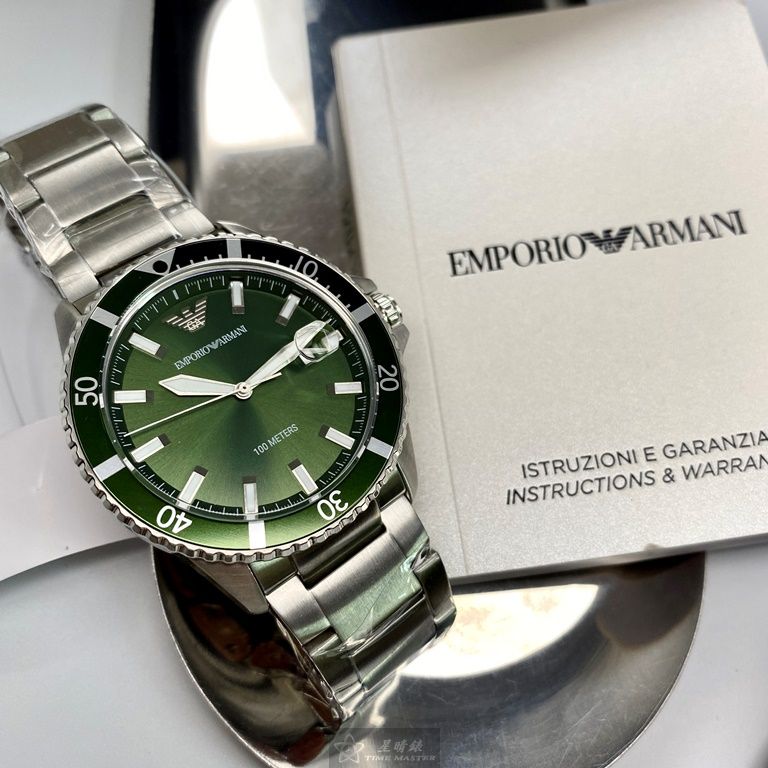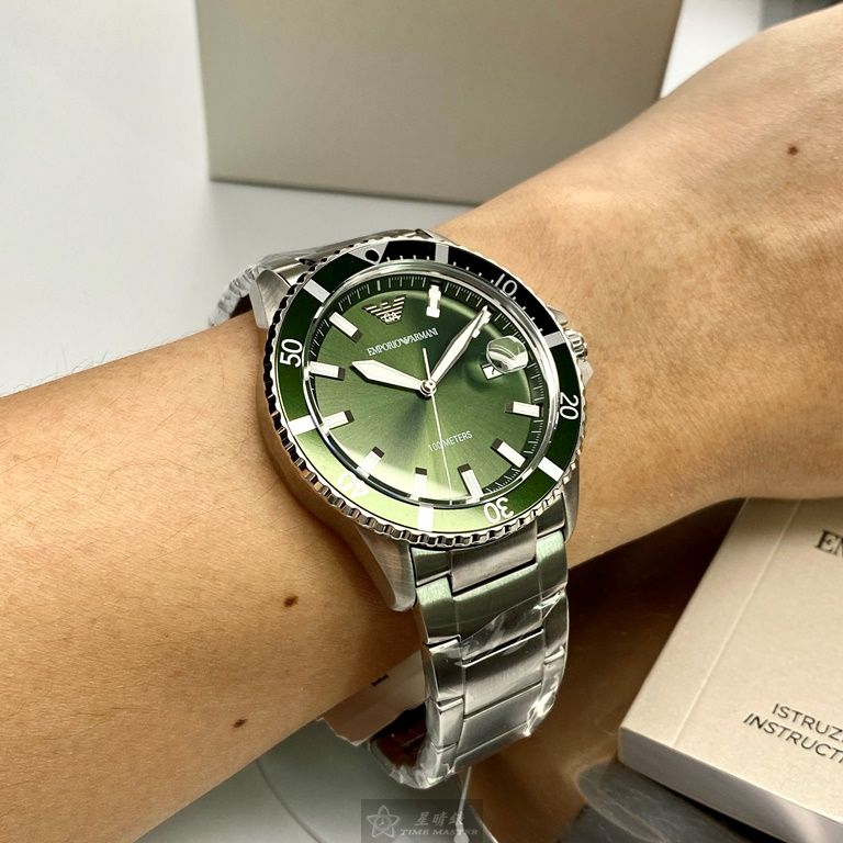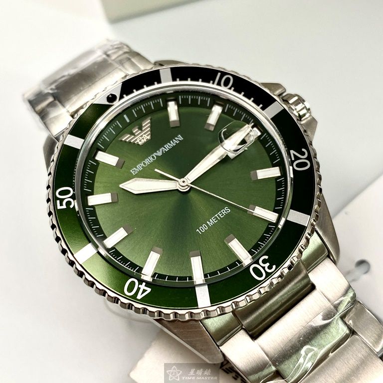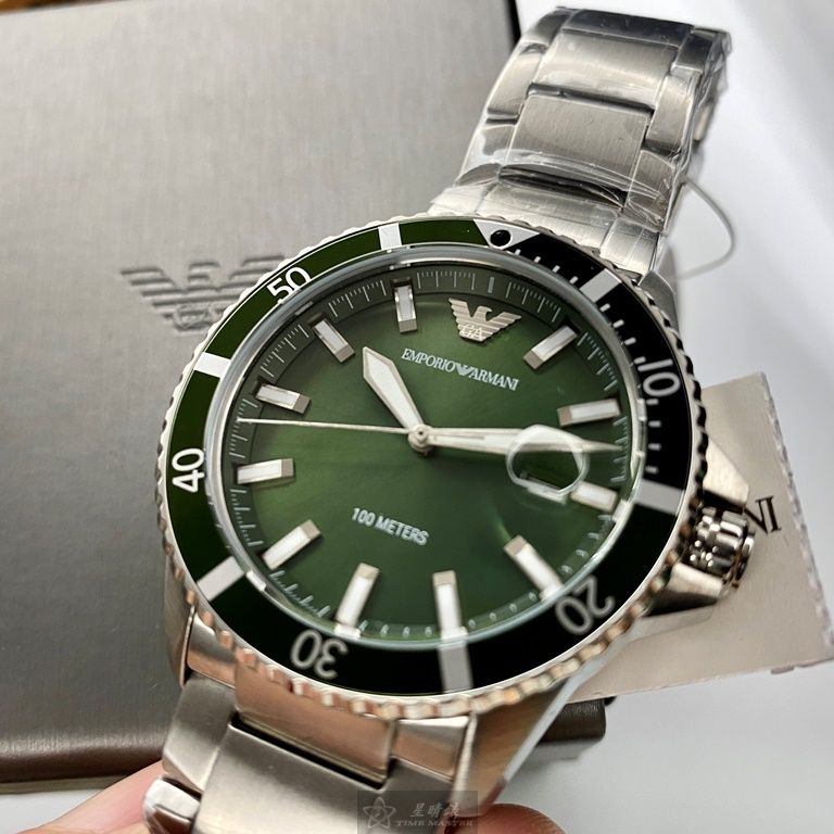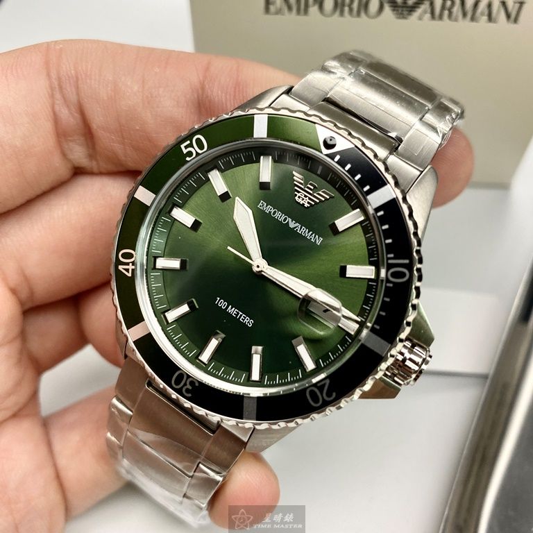 ARMANI手錶,編號AR00011,42mm銀綠色圓形精鋼錶殼,墨綠色潛水錶, 水鬼錶面,銀色精鋼錶帶款
