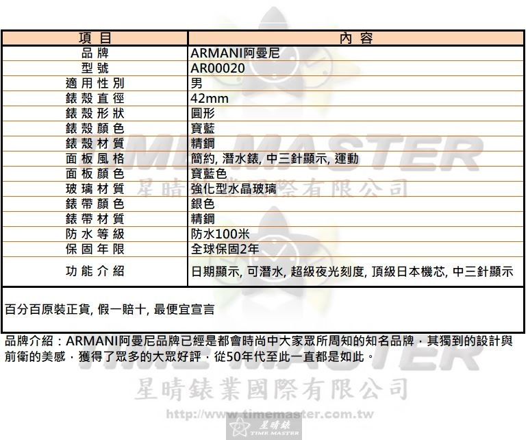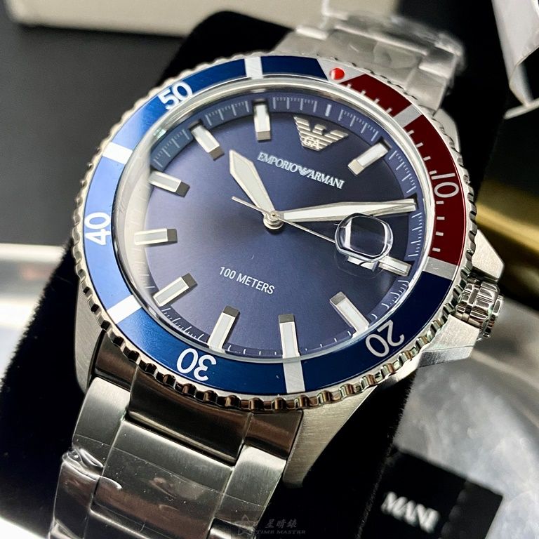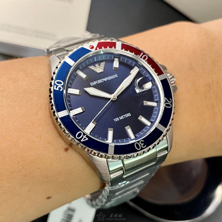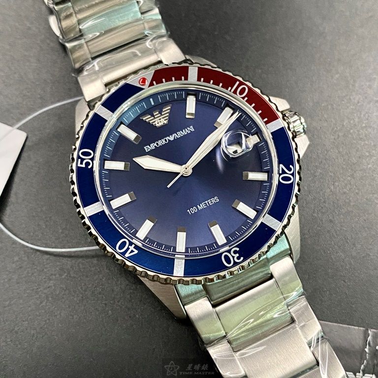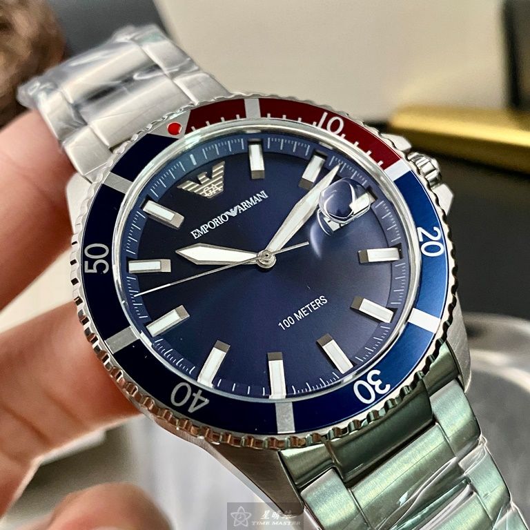 ARMANI手錶,編號AR00020,42mm寶藍錶殼,銀色錶帶款