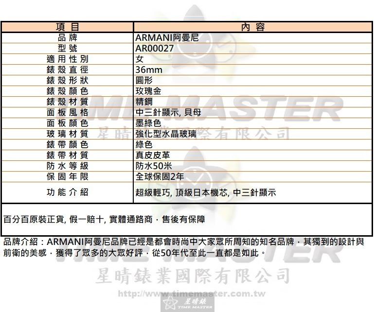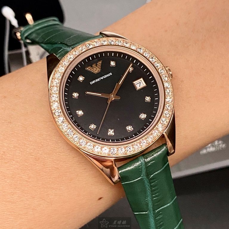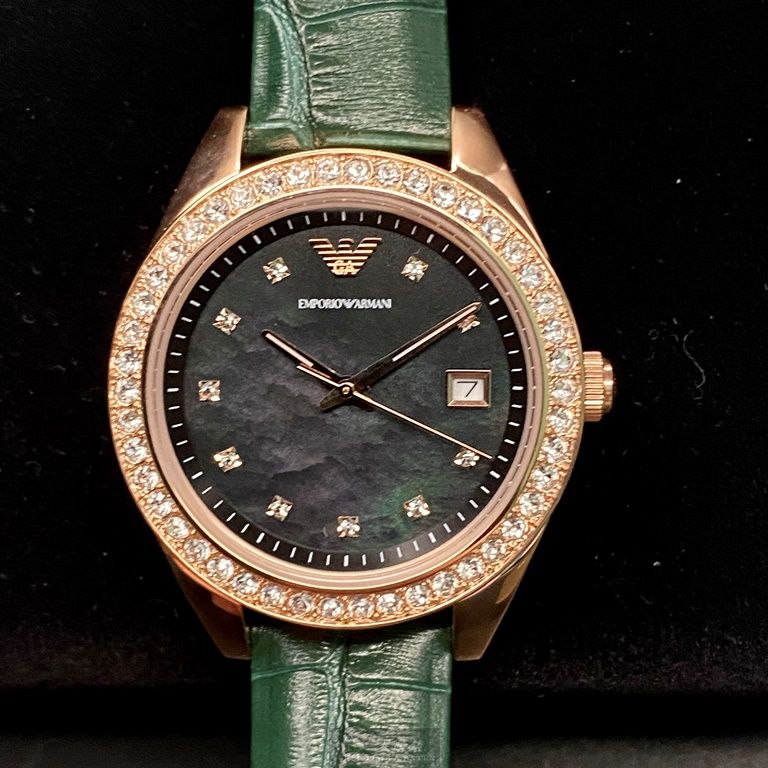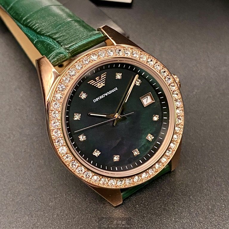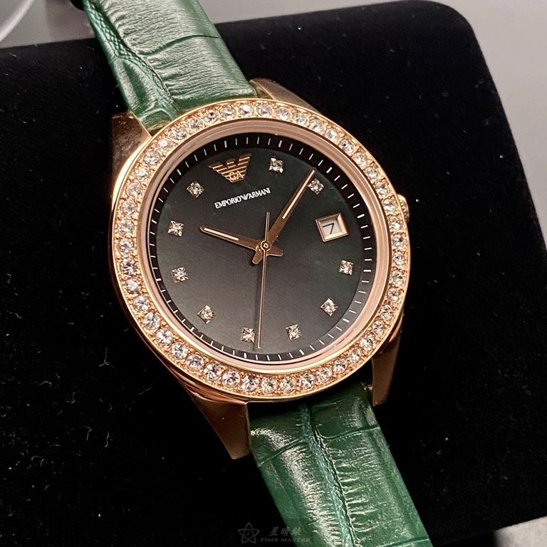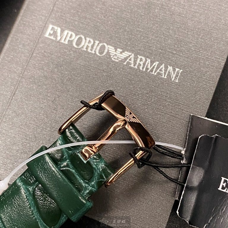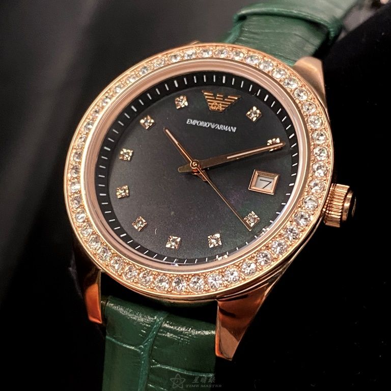 ARMANI手錶,編號AR00027,36mm玫瑰金圓形精鋼錶殼,墨綠色中三針顯示, 貝母錶面,綠色真皮皮革錶帶款