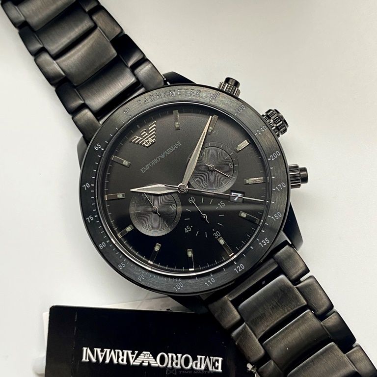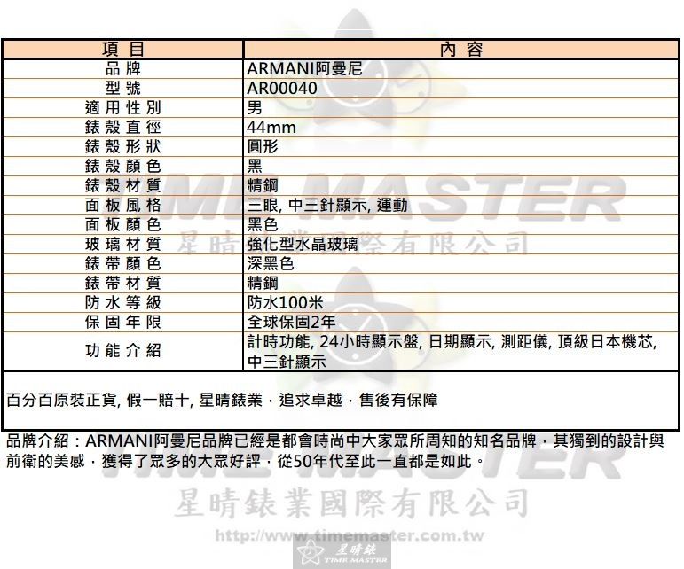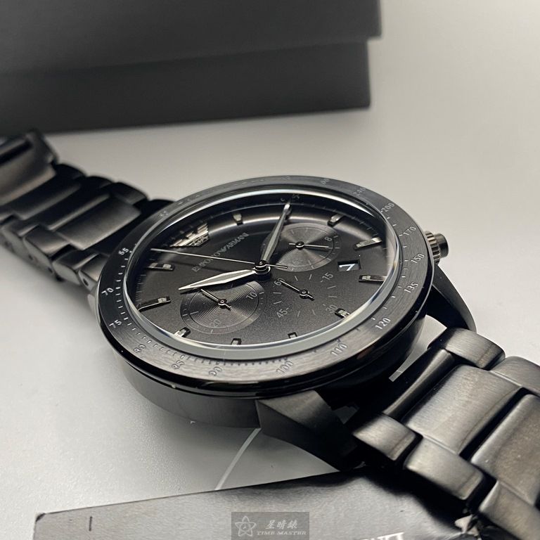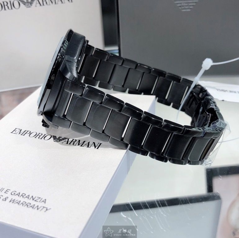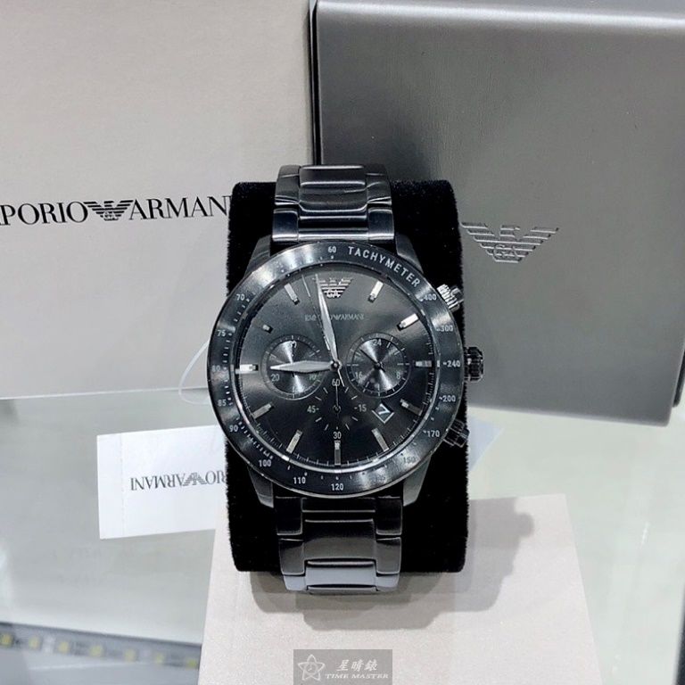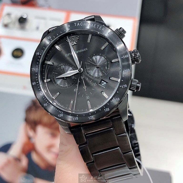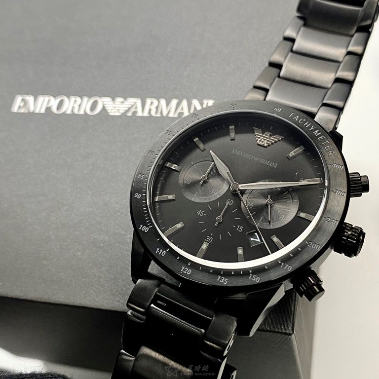 ARMANI手錶,編號AR00040,44mm黑圓形精鋼錶殼,黑色三眼, 中三針顯示, 運動錶面,深黑色精鋼錶帶款