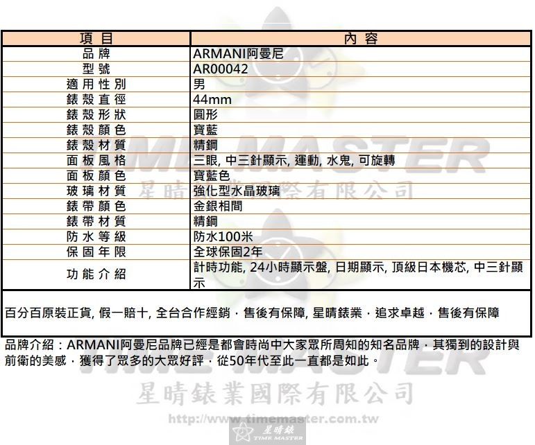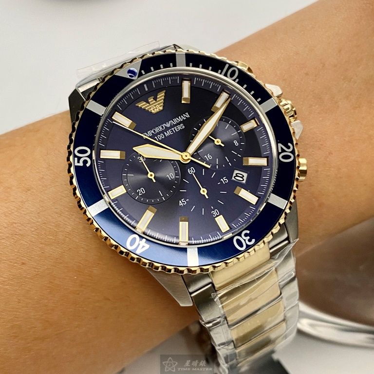 ARMANI手錶,編號AR00042,44mm寶藍錶殼,金銀相間錶帶款