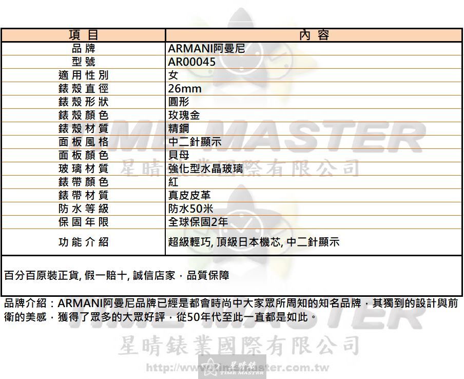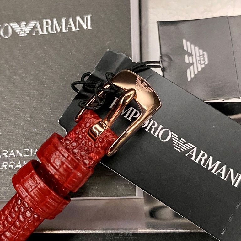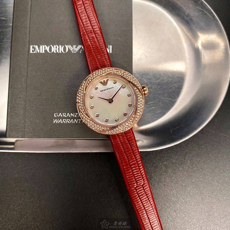 ARMANI手錶,編號AR00045,26mm玫瑰金圓形精鋼錶殼,貝母中二針顯示錶面,紅真皮皮革錶帶款