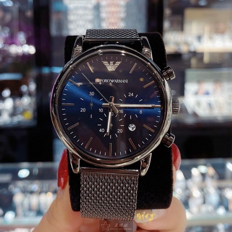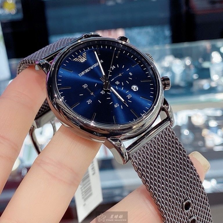 ARMANI手錶,編號AR00056,44mm黑圓形精鋼錶殼,寶藍色三眼, 中三針顯示錶面,鐵灰色米蘭錶帶款