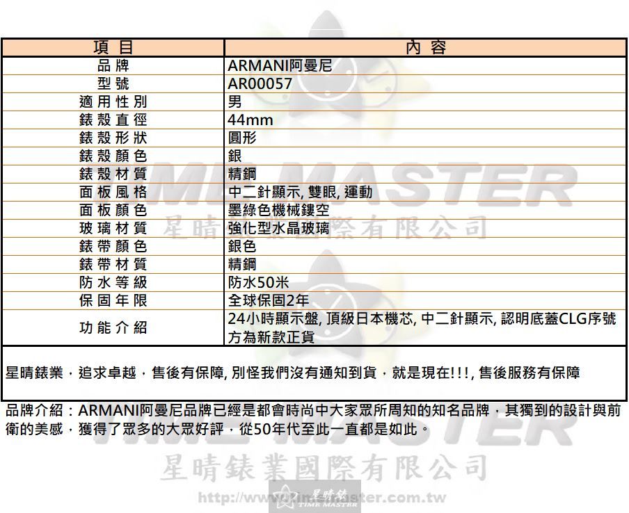ARMANI手錶,編號AR00057,44mm銀錶殼,銀色錶帶款