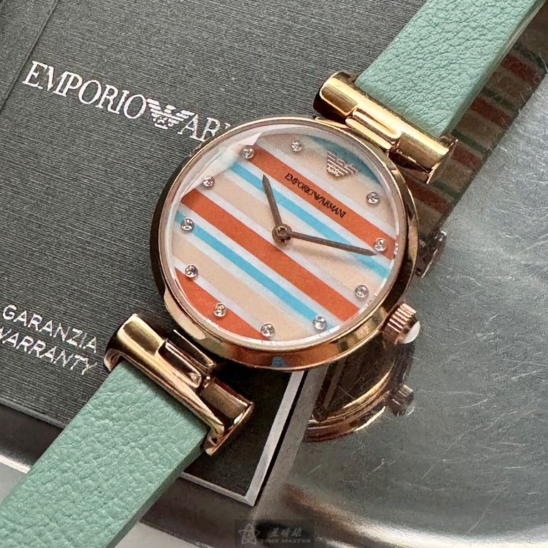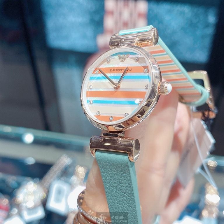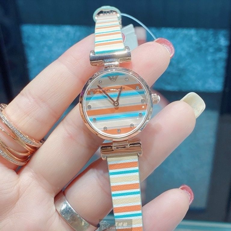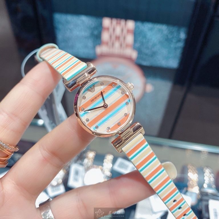 ARMANI手錶,編號AR00059,28mm玫瑰金圓形精鋼錶殼,幾何立體圖形中二針顯示錶面,多色真皮皮革錶帶款