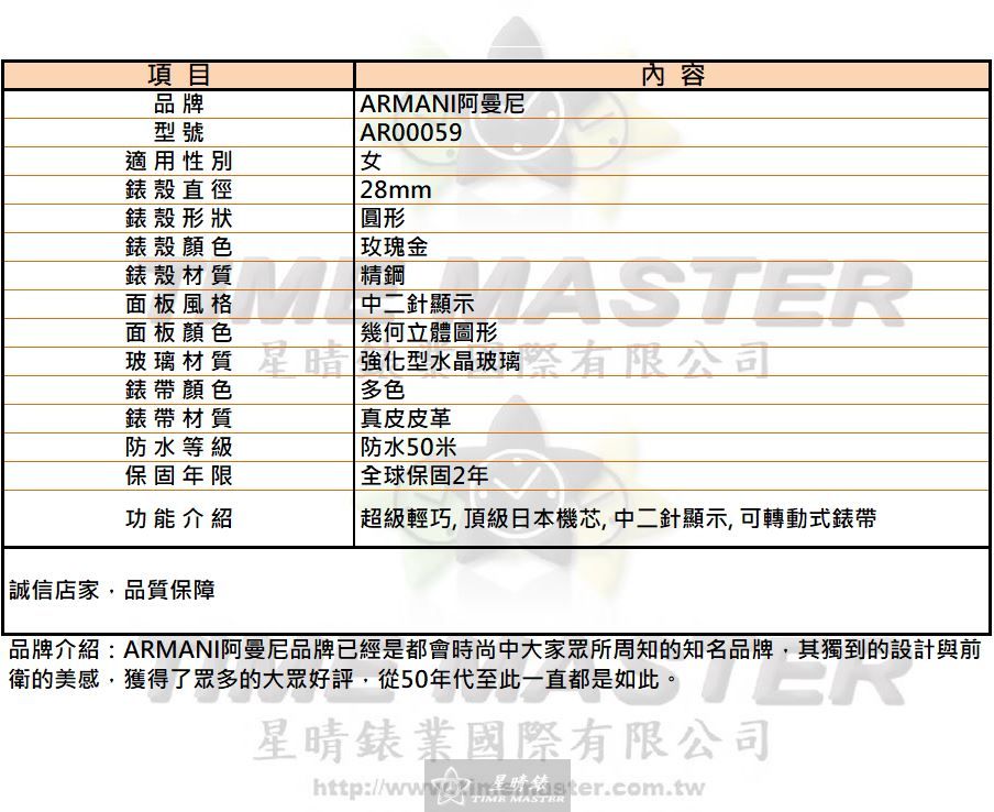 ARMANI阿曼尼 AR00059 女錶,錶殼直徑28mm,玫瑰金精鋼材質搭配中二針幾何立體面板,質感精緻,價格雖非最低,但每一處細節都經過仔細打磨。 ARMANI阿曼尼 AR00059 女錶採用頂級日本石英機芯,精準可靠,佩戴舒適輕巧,是日常生活與重要場合都能信賴的選擇。 ARMANI阿曼尼 AR00059 女錶的錶帶為多色真皮皮革,柔軟貼合手腕,可轉動式設計方便調整,雖然價位不便宜,但耐用與舒適兼具。 ARMANI阿曼尼 AR00059 女錶強化型水晶玻璃面板,不易刮傷,清晰顯示時間,實用性高,為追求品質的女性提供可靠伴侶。 ARMANI阿曼尼 AR00059 女錶防水50米,日常洗手或短暫淋雨無憂,雖不是專業潛水錶,但耐用度足以支撐日常需求。 ARMANI阿曼尼 AR00059 女錶圓形錶殼設計簡約優雅,細膩的玫瑰金色調與幾何面板搭配,呈現低調的質感美學。 ARMANI阿曼尼 AR00059 女錶中二針顯示方式簡潔明瞭,操作直覺,兼顧視覺美感與實用功能,價格合理但不將就品質。 ARMANI阿曼尼 AR00059 女錶輕巧設計,長時間佩戴仍舒適無負擔,細緻做工讓每個佩戴瞬間都展現用心。 ARMANI阿曼尼 AR00059 女錶全球保固2年,售後服務可靠,雖價格非最低,但保證每位消費者安心使用。 ARMANI阿曼尼 AR00059 女錶整體設計注重實用與美感平衡,選擇這款錶,不只是買商品,更是選擇一份細膩耐用的品質承諾。