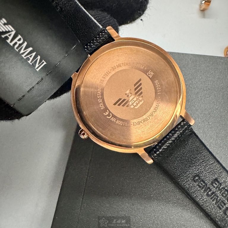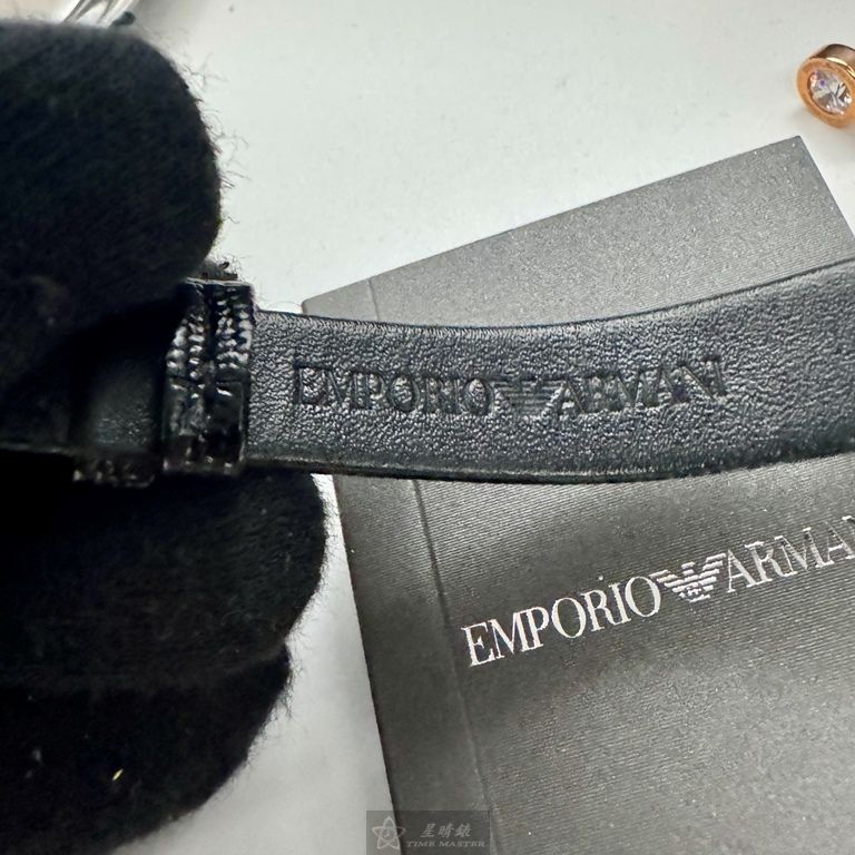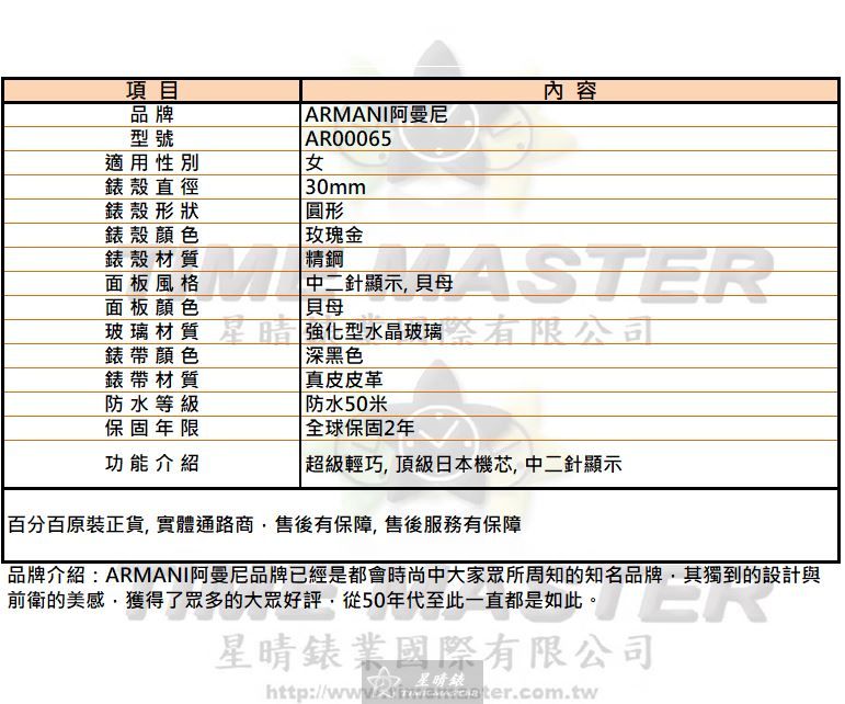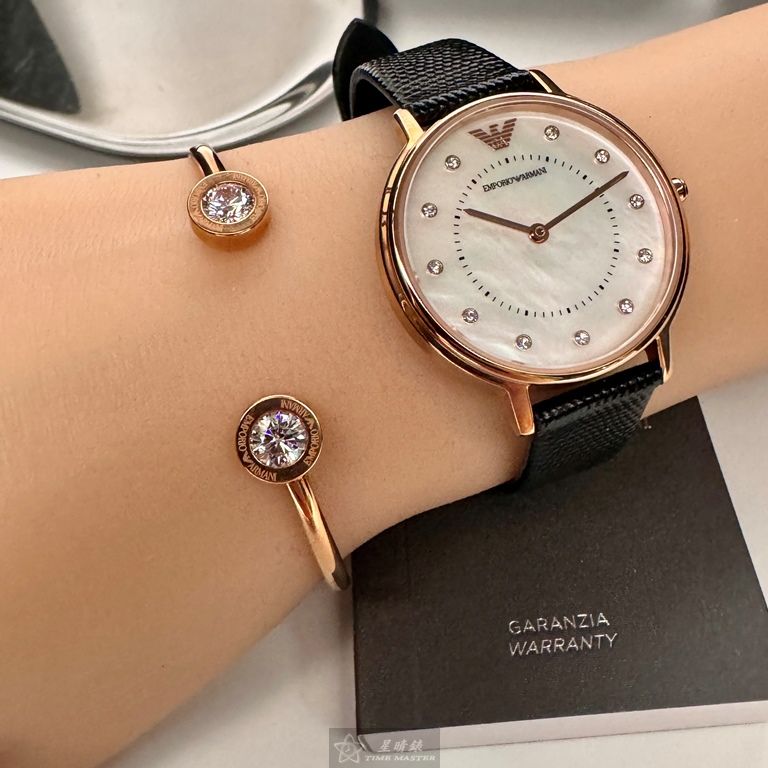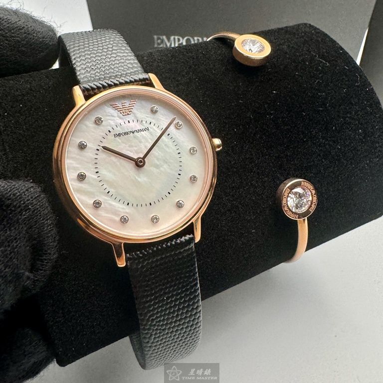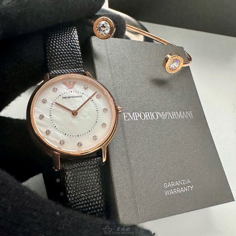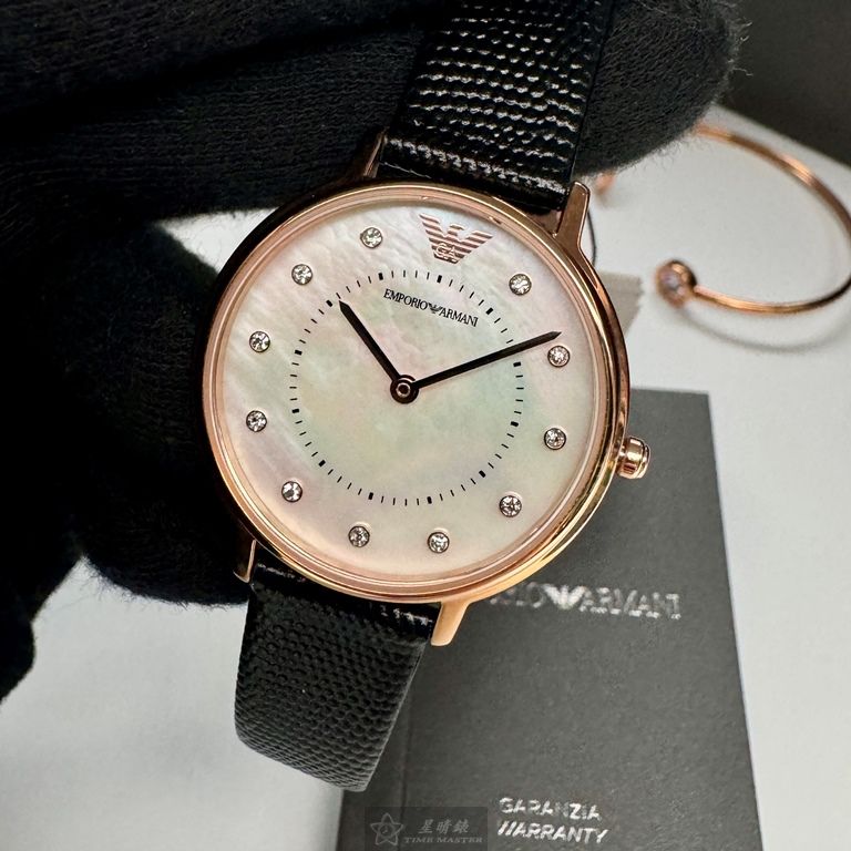 ARMANI手錶,編號AR00065,30mm玫瑰金圓形精鋼錶殼,貝母中二針顯示, 貝母錶面,深黑色真皮皮革錶帶款