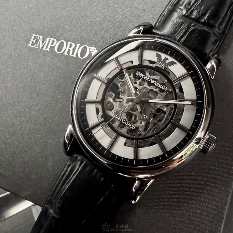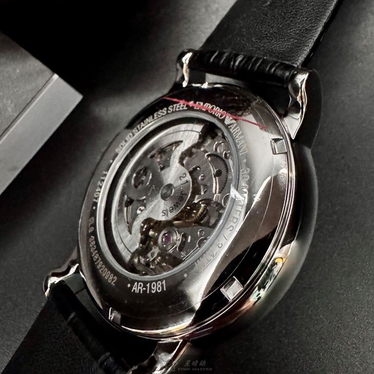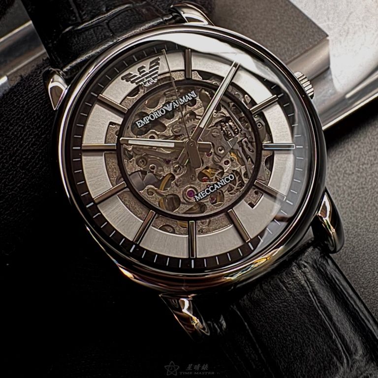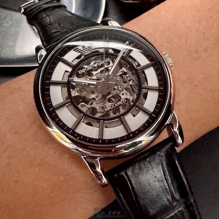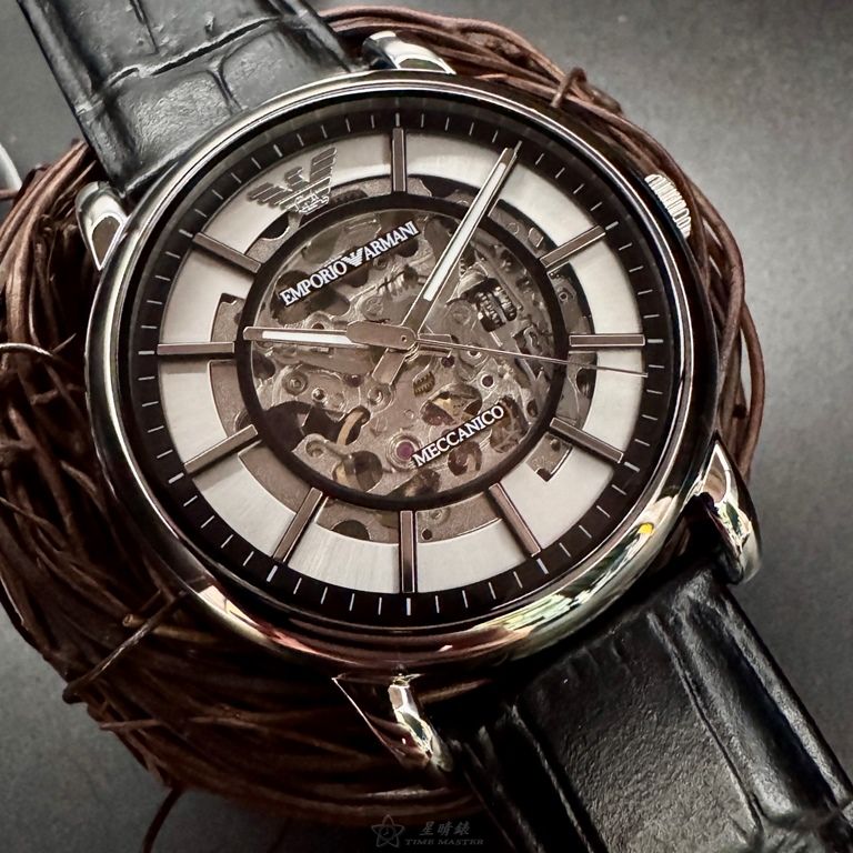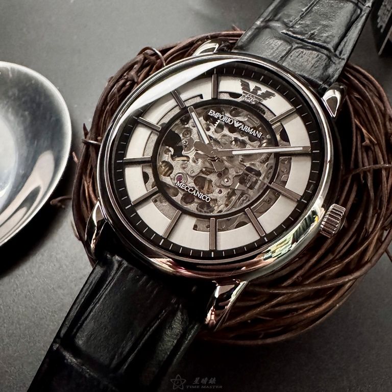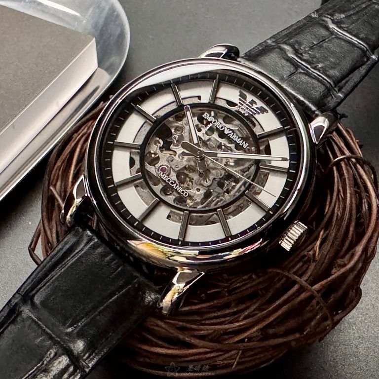 ARMANI手錶,編號AR00073,44mm銀圓形精鋼錶殼,機械鏤空鏤空, 中三針顯示錶面,深黑色真皮皮革錶帶款