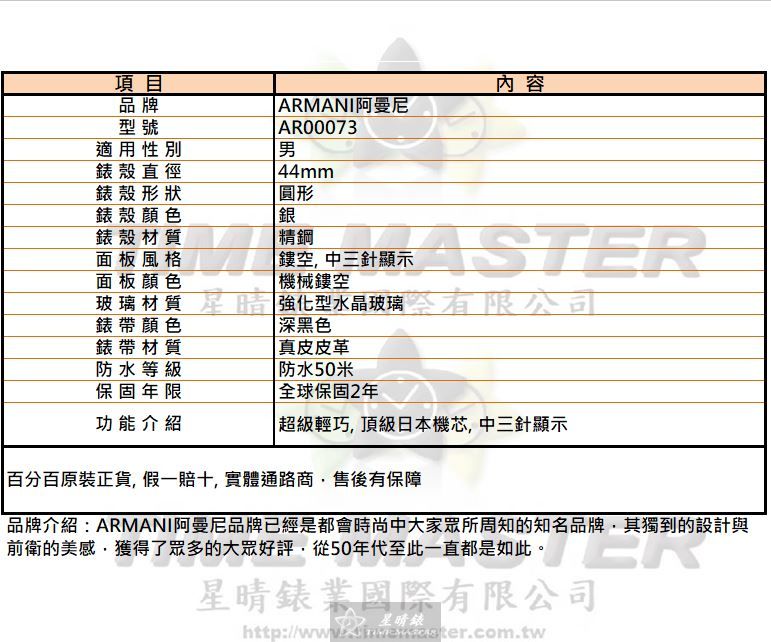 ARMANI阿曼尼 AR00073 男士自動機械錶,44mm精鋼圓形錶殼,鏤空面盤設計,讓時間不只是流動,而是可以被看見的機械節奏。 這不是市面上最耀眼或最多功能的手錶,但每個零件都經過挑選,為的是提供穩定、實在的時間體驗。 我們知道它的價格不是最低,但星晴錶業賣的是正貨保障,而不是短暫的便宜與模糊的來源。 深黑色真皮錶帶搭配銀色精鋼錶殼,沉穩不張揚,適合肩負責任、注重細節的你。 這款錶使用強化水晶玻璃,減少日常刮傷的煩惱,是設計上的一種貼心而務實的選擇。 防水50米不是極限運動規格,但足夠應付日常洗手、雨水甚至偶爾潑濺的狀況。 全球保固兩年,不只是售後服務,更是對產品品質與我們使命的承諾。 內部搭載頂級日本機芯,維持中三針顯示穩定輸出,是對時間的尊重與理解。 星晴錶業不急著賣出每一只錶,而是希望每一位戴上它的人,都明白這背後的工藝與價值。 AR00073不是最華麗的選擇,但它是懂得時間份量之人的選擇。