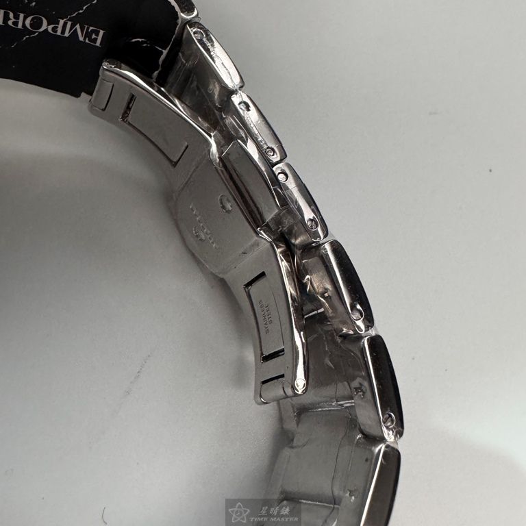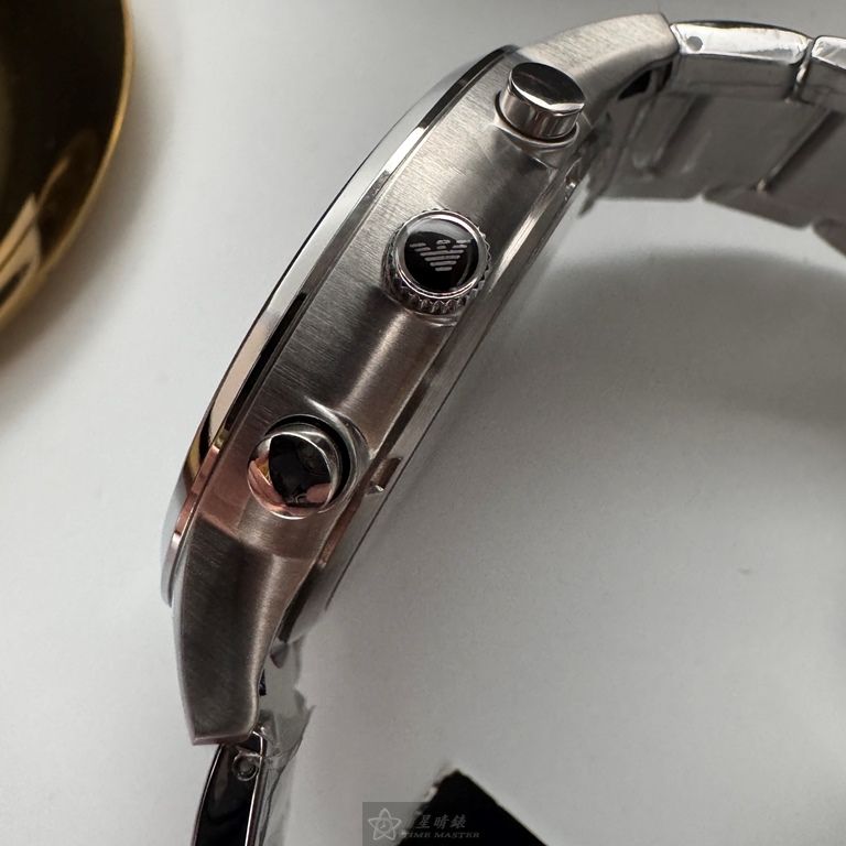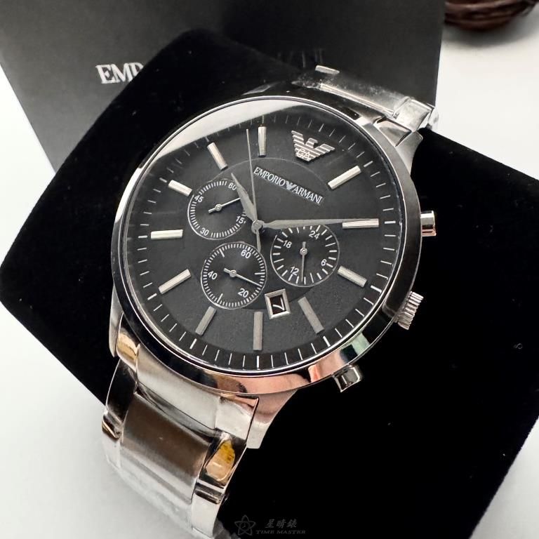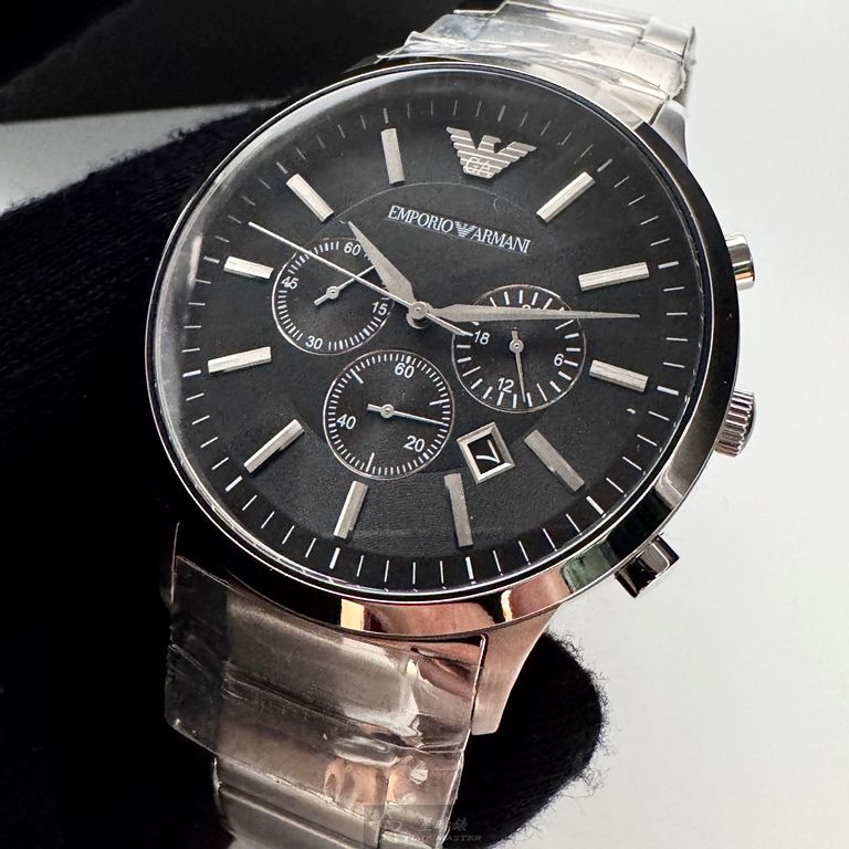 ARMANI手錶,編號AR00075,46mm銀圓形精鋼錶殼,黑色三眼, 中三針顯示, 運動錶面,銀色精鋼錶帶款