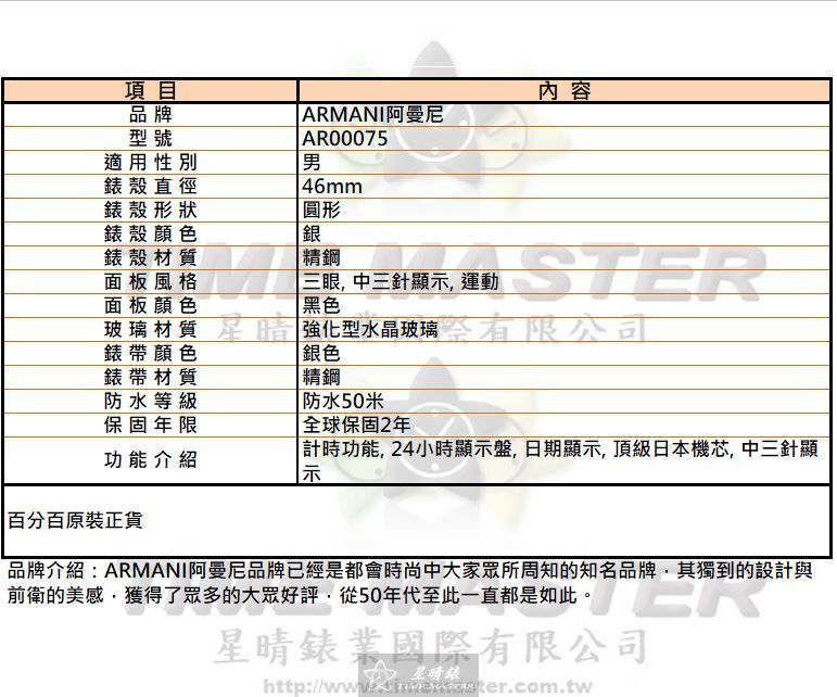ARMANI阿曼尼 AR00075 46mm 男錶,精鋼圓形錶殼搭配黑色運動面板,雖然價格不是最低,但每個細節都經過精心打磨,帶來穩定可靠的佩戴體驗。 精鋼錶帶與錶殼完美呼應,搭載強化型水晶玻璃面板,能抵抗日常刮擦,雖非頂級防刮,但耐用性仍遠超同價位商品。 中三針與三眼計時設計,讓時間閱讀清晰直觀,即便石英機芯簡單,計時精度仍可滿足日常與運動需求。 錶款提供50米防水能力,適合日常生活與輕度水上活動使用,雖無法潛水,但足以應對雨天與洗手環境。 日期顯示與24小時盤功能,讓使用者方便掌握全天時間安排,實用性明確,沒有過度裝飾卻貼近需求。 腕錶整體重量與佩戴感平衡,精鋼材質雖有分量,但佩戴舒適,體現品質而非廉價感。 頂級日本機芯雖非瑞士機芯,但以穩定與耐用著稱,讓你日常佩戴無須頻繁調校。 銀色錶殼與錶帶,搭配黑色面板,低調中帶運動感,外觀簡潔卻充滿男性韻味,適合多種場合。 全球保固2年,售後服務明確可靠,即便價格非最便宜,也讓你安心購買,價值感隨之提升。 ARMANI阿曼尼 AR00075 46mm 男錶,承擔的不只是計時使命,更是一份對品質與細節的堅持,讓你每次佩戴都感受到踏實與專注。