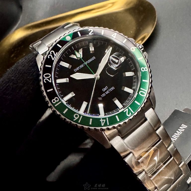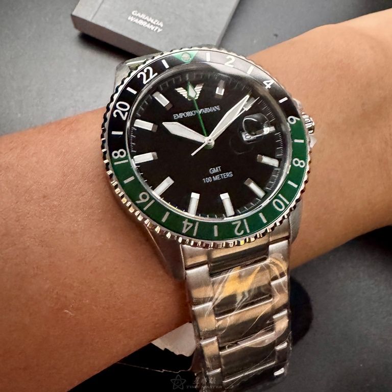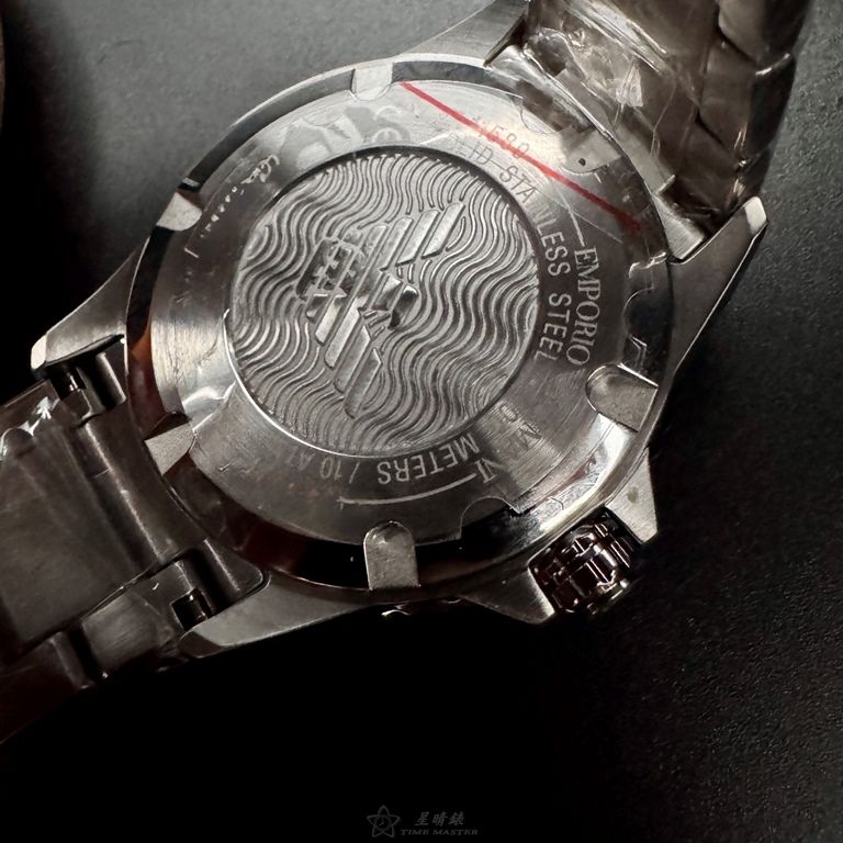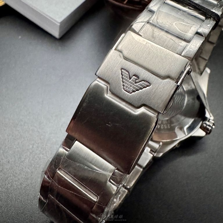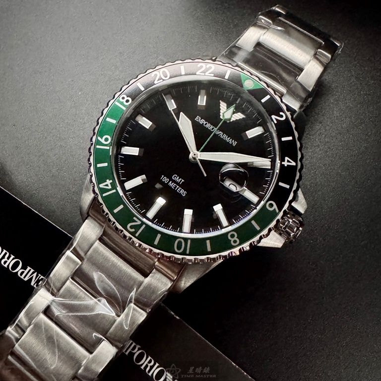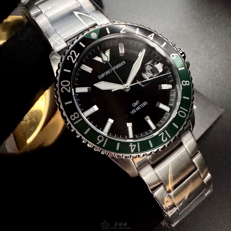 ARMANI手錶,編號AR00078,42mm銀圓形精鋼錶殼,黑色三眼, 潛水錶, 水鬼, 可旋轉錶面,銀色精鋼錶帶款