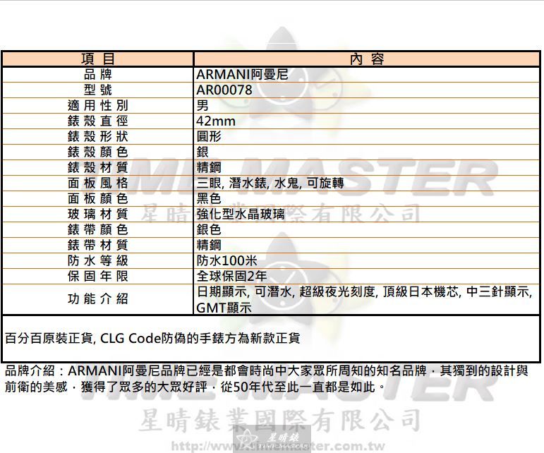 ARMANI阿曼尼 AR00078 42mm 男錶以精鋼錶殼搭配黑色三眼潛水面板,展現務實耐用的設計理念,雖非最便宜,但每個細節都追求品質精良。 錶款搭載頂級日本石英機芯與中三針顯示,日期與GMT功能清楚呈現時間資訊,讓每日使用充滿可靠感。 42mm圓形銀色錶殼搭配精鋼錶帶,耐用且舒適,價格雖然不低,卻保證長期佩戴依舊穩定耐磨。 強化型水晶玻璃與超級夜光刻度設計,使手錶在光線不足環境也能清晰讀時,務實滿足日常需求。 潛水錶設計支援100米防水,無論游泳或日常洗手都能安心佩戴,價格合理卻提供完整防護。 可旋轉錶圈與三眼功能增加實用性,讓手錶在日常與戶外場合皆能應對自如。 銀色精鋼錶帶堅固耐用,與錶殼色澤統一,展現低調卻可靠的專業感,適合追求品質的人士。 全球保固2年,提供購買安心保障,雖不是市場最便宜選擇,但每一分投入都換來安心與耐用。 手錶設計細膩務實,強調功能性與日常耐用性,讓佩戴者在每個瞬間都感受到可靠品質。 ARMANI阿曼尼 AR00078 42mm 男錶肩負精準與耐用使命,雖不追求華麗大詞,卻在每個細節上堅持做好一枚好錶的責任。
