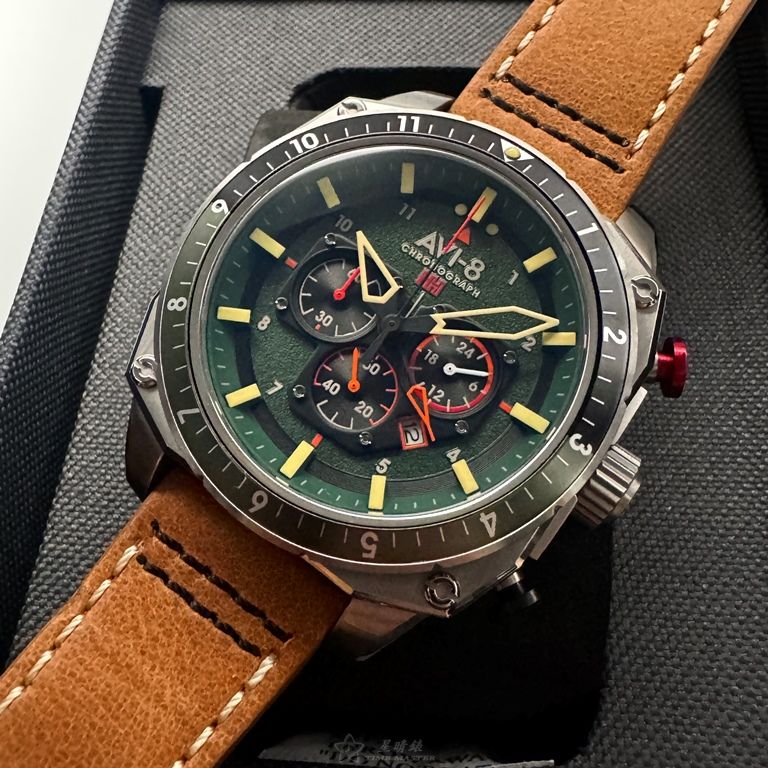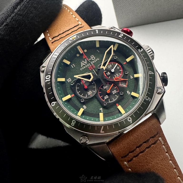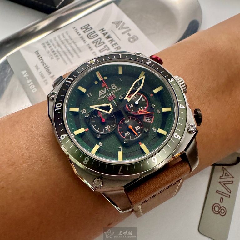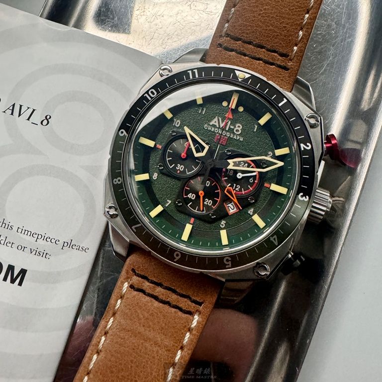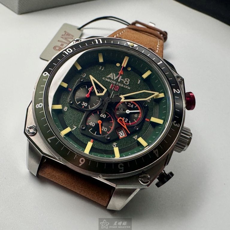 AVI-8手錶,編號AV52111,44mm銀圓形精鋼錶殼,墨綠色三眼, 中三針顯示, 運動錶面,咖啡色真皮皮革錶帶款