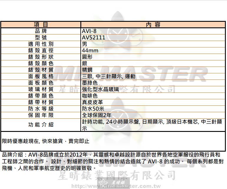 AVI-8 AV52111 男錶 44mm 錶殼,精鋼打造,墨綠三眼面板搭配咖啡色真皮錶帶,石英機芯穩定可靠,雖不是市場最便宜,但價格與品質成正比。 AVI-8 AV52111 男錶 44mm 錶殼,運動風格設計,具備計時功能與24小時顯示盤,每一次操作都感受精準的日本機芯用心。 AVI-8 AV52111 男錶 44mm 錶殼,強化水晶玻璃保護,抗刮耐用,適合日常生活與簡單運動,價位合理,耐用性令人安心。 AVI-8 AV52111 男錶 44mm 錶殼,圓形設計簡潔俐落,咖啡色真皮錶帶柔軟貼手,整體質感雖不浮誇,但細節展現用心。 AVI-8 AV52111 男錶 44mm 錶殼,防水50米,生活防水足夠應對洗手、下雨,兼顧實用與美觀,價錢不低卻值得。 AVI-8 AV52111 男錶 44mm 錶殼,日期顯示與中三針設計清楚易讀,功能務實,不追求花巧,但每一分錢都買到可靠。 AVI-8 AV52111 男錶 44mm 錶殼,全球保固兩年,售後有保障,品質穩定,雖不便宜,但這份安心無價。 AVI-8 AV52111 男錶 44mm 錶殼,墨綠色面板低調沉穩,運動風格與精鋼材質融合,外觀與耐用兼顧,價格反映真材實料。 AVI-8 AV52111 男錶 44mm 錶殼,頂級日本石英機芯精準可靠,每一次計時都細膩實用,為日常生活增添實在感。 AVI-8 AV52111 男錶 44mm 錶殼,設計承載使命感,無論是上班或休閒,都能感受到錶款對細節與耐用的堅持,價格雖非最低,但物超所值。