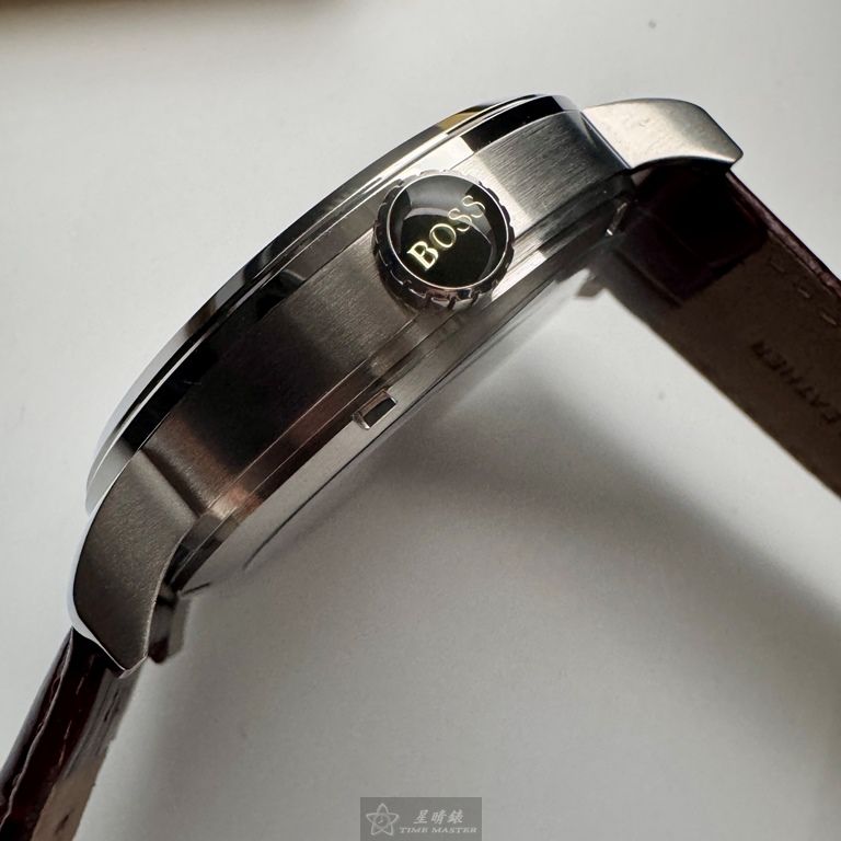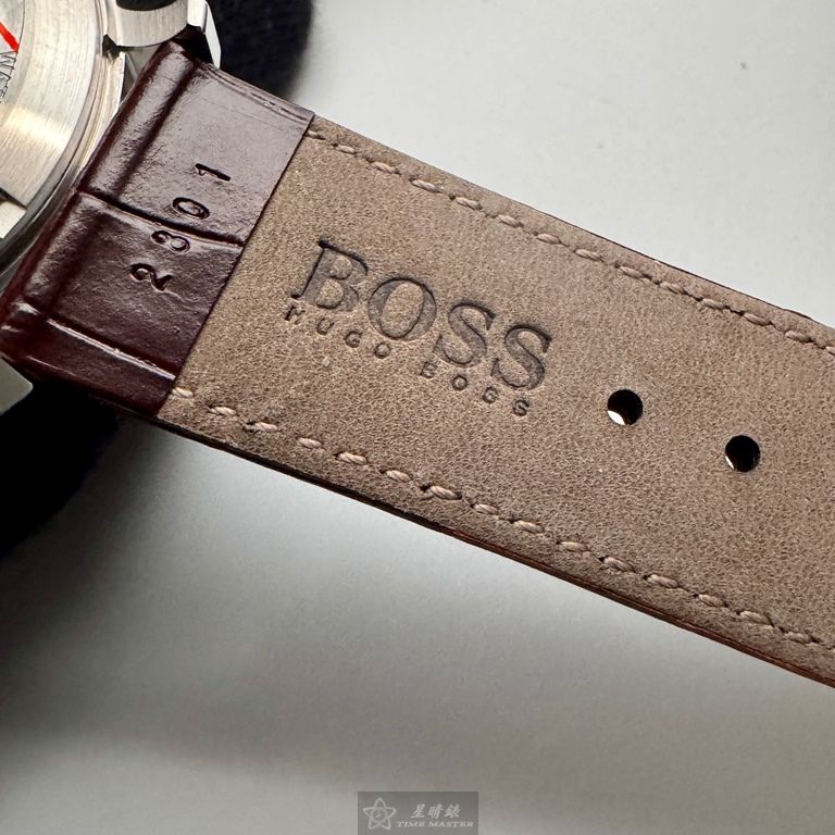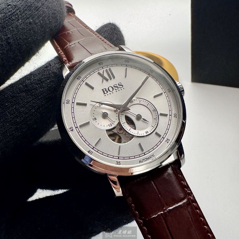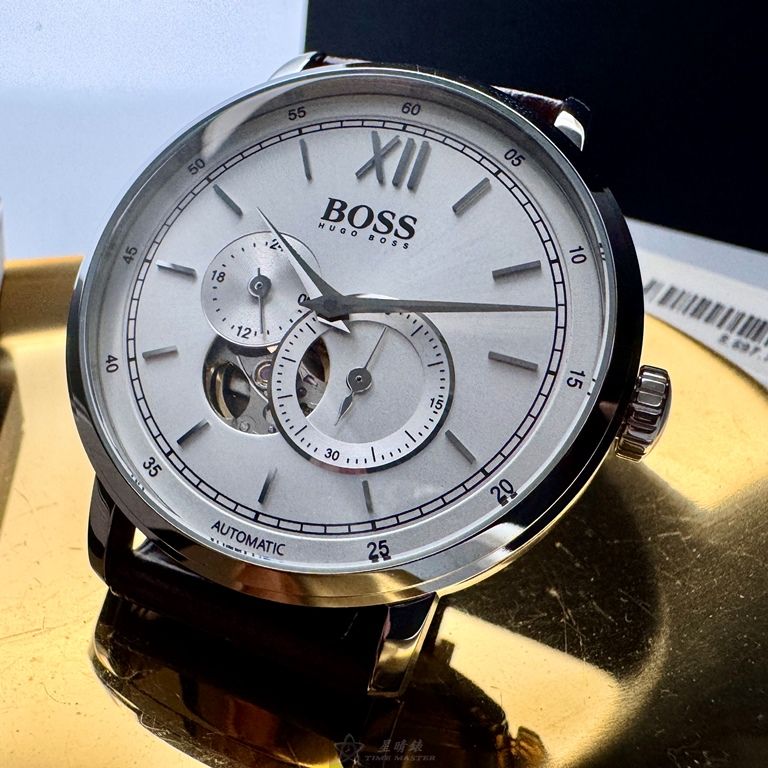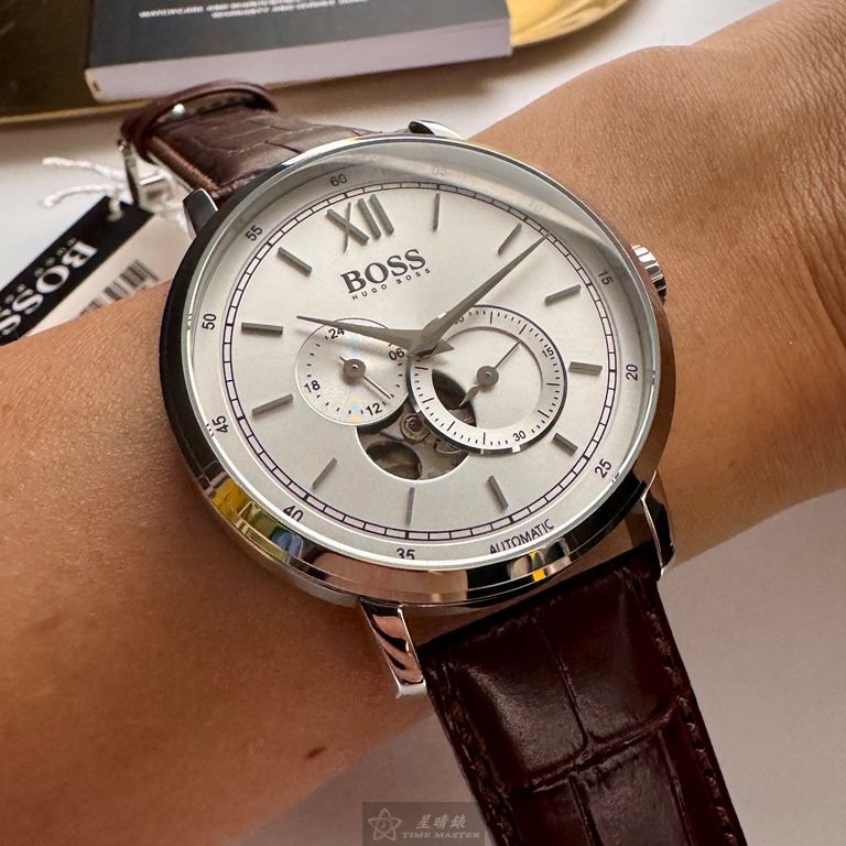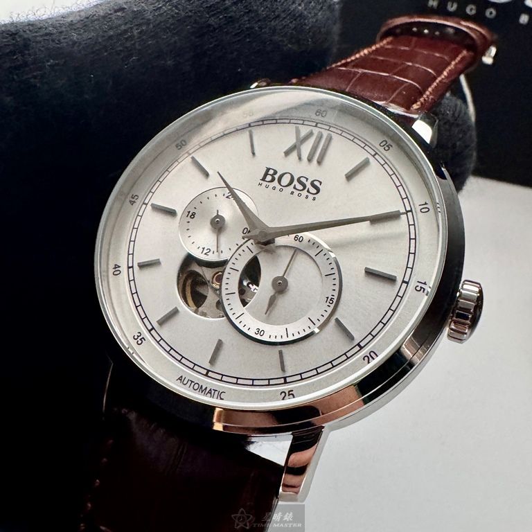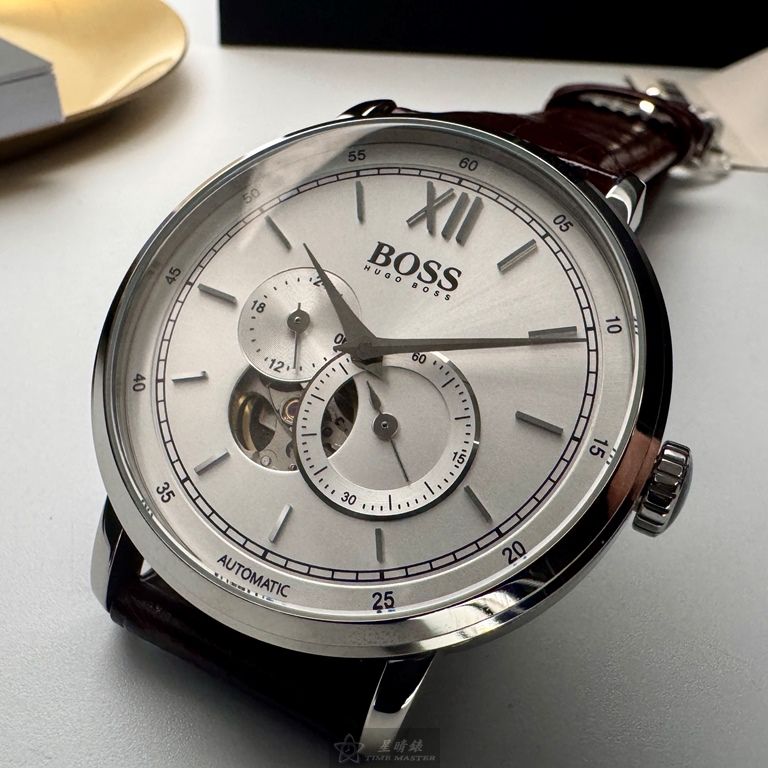 BOSS手錶,編號HB1513505,44mm銀圓形精鋼錶殼,銀白色鏤空, 中三針顯示, 二眼錶面,咖啡色真皮皮革錶帶款
