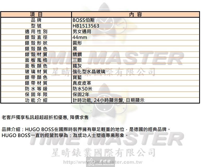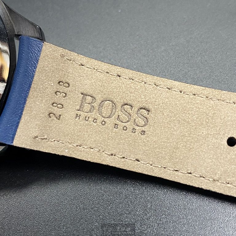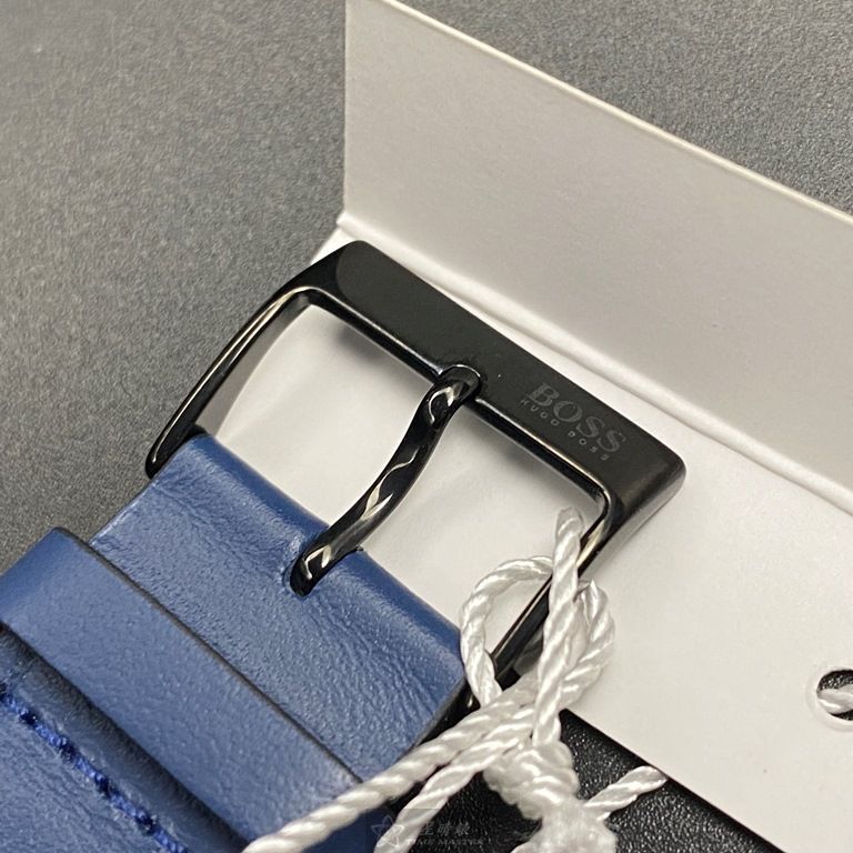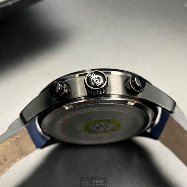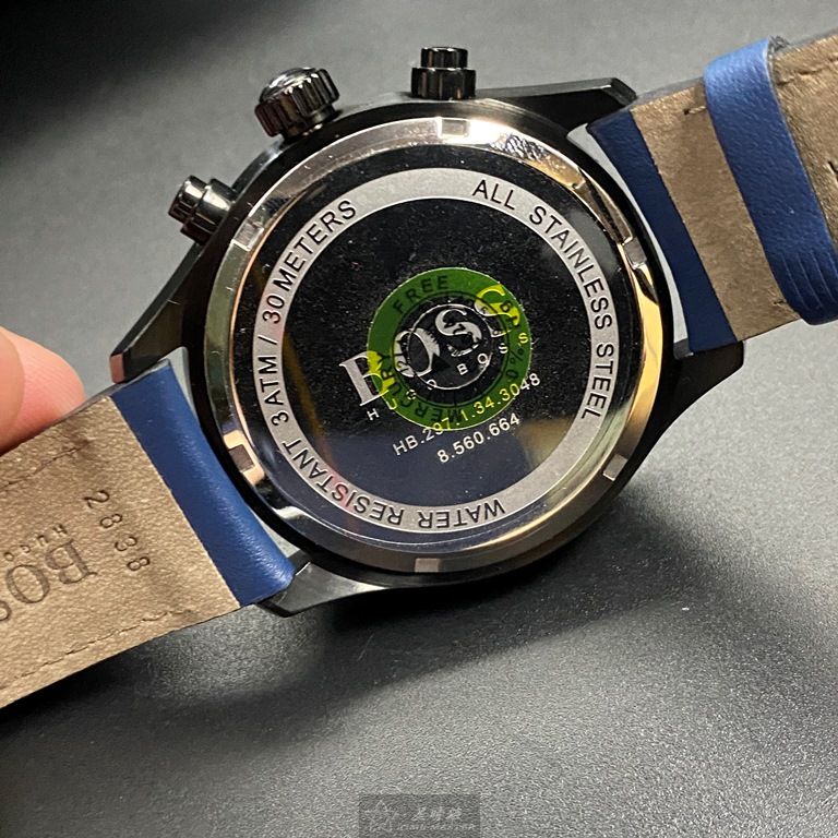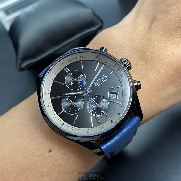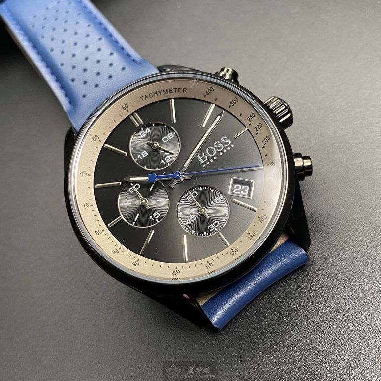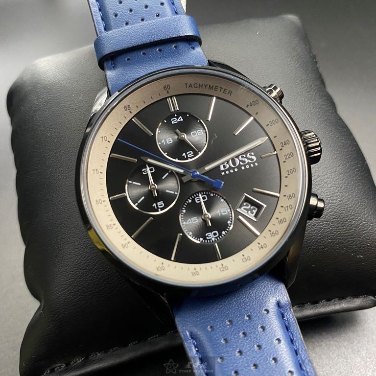 BOSS手錶,編號HB1513563,44mm黑圓形精鋼錶殼,鐵灰三眼錶面,寶藍真皮皮革錶帶款,閃亮度冠絕全場!