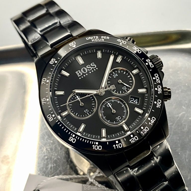 BOSS手錶,編號HB1513754,44mm黑圓形精鋼錶殼,黑色三眼, 中三針顯示, 運動錶面,深黑色精鋼錶帶款
