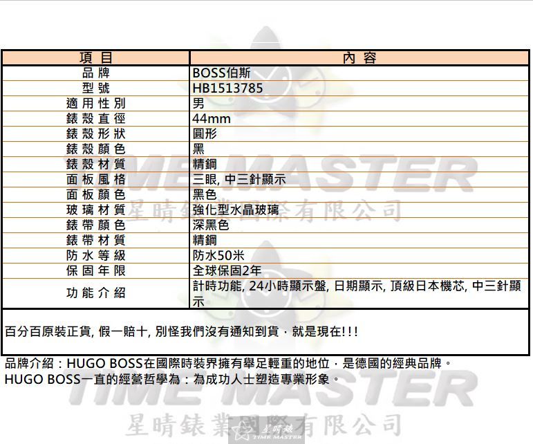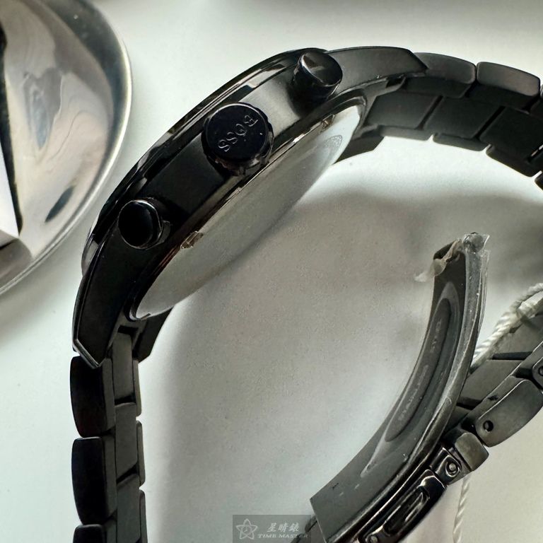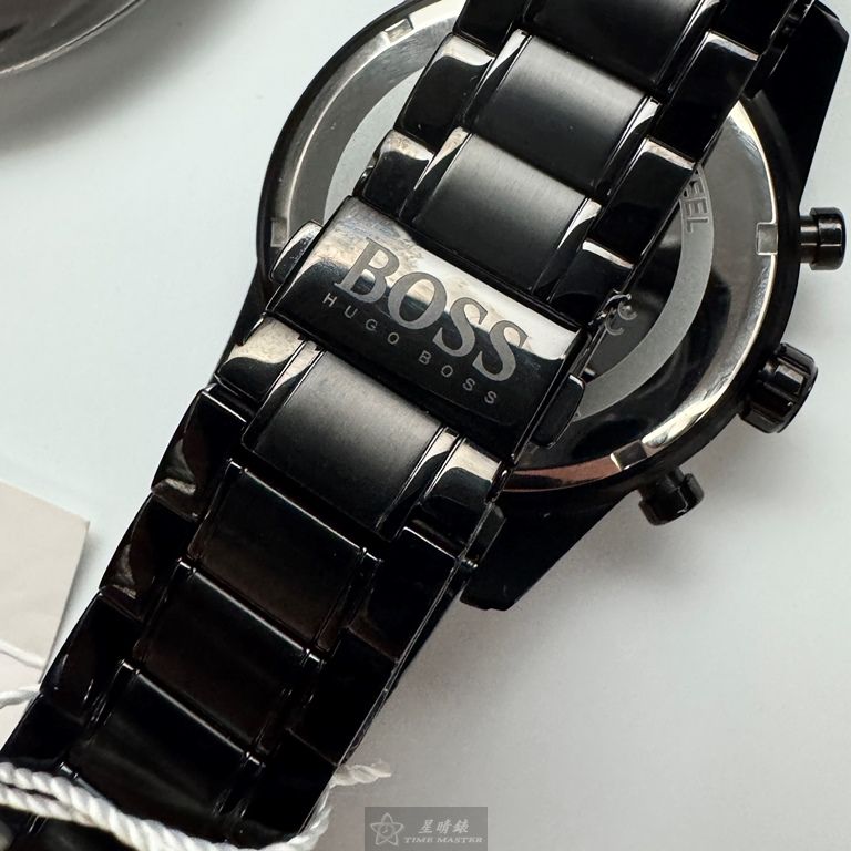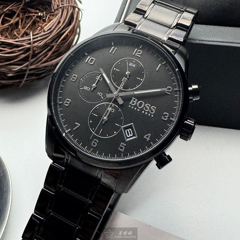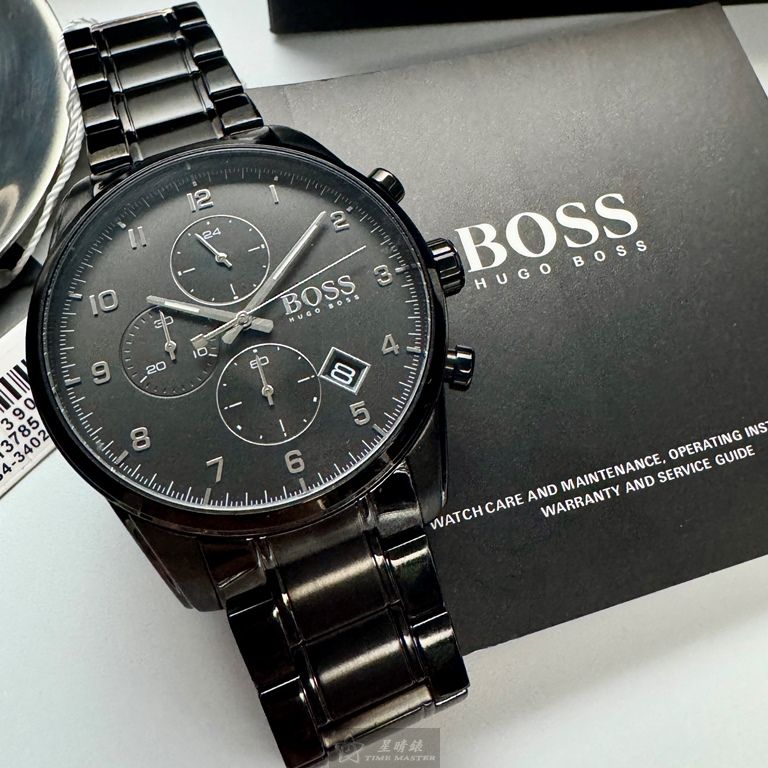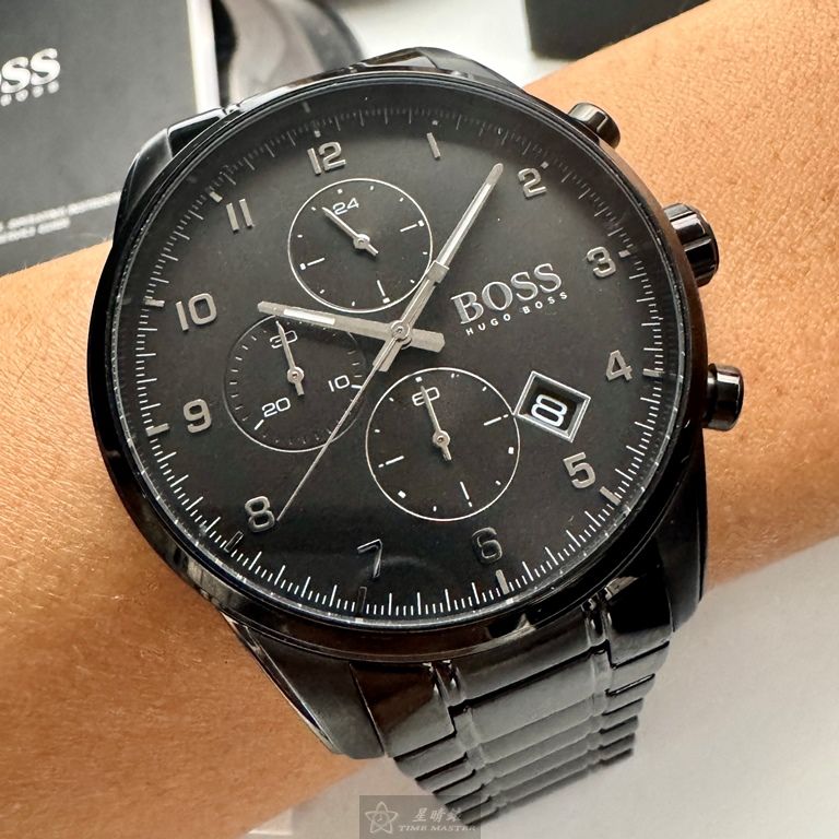 BOSS手錶,編號HB1513785,44mm黑圓形精鋼錶殼,黑色三眼, 中三針顯示錶面,深黑色精鋼錶帶款