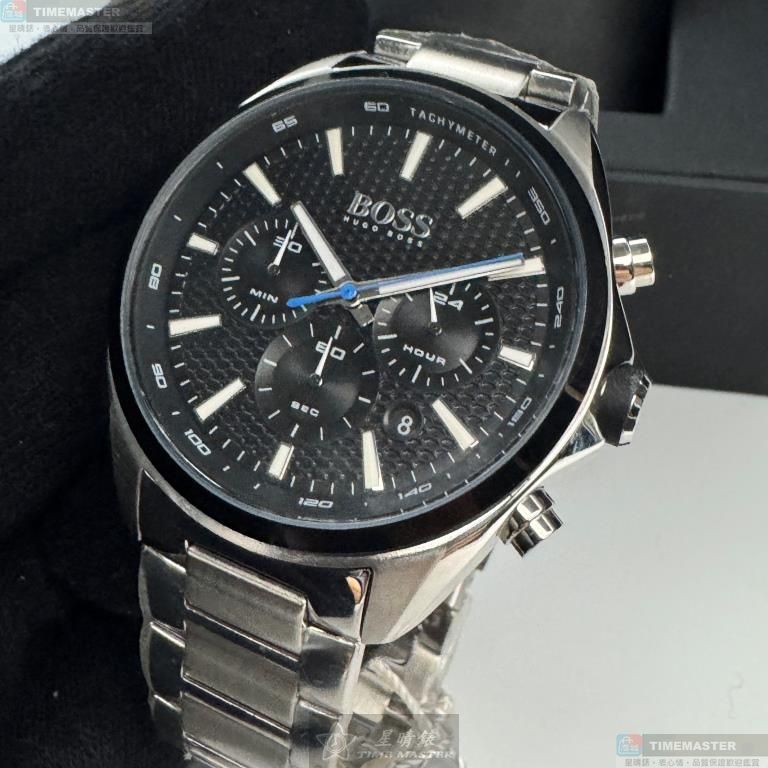 BOSS手錶,編號HB1513857,46mm銀圓形精鋼錶殼,黑色三眼, 中三針顯示, 運動錶面,銀色精鋼錶帶款