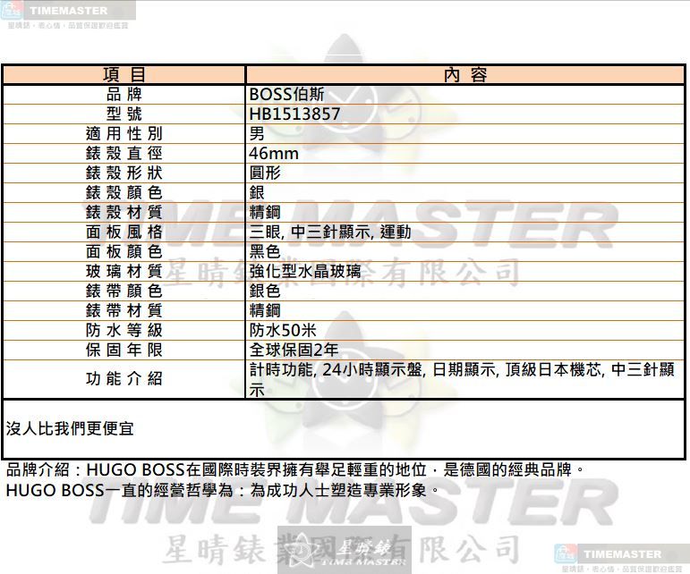 BOSS伯斯 HB1513857 男錶不是市場上最浮誇的款式,但在日常配戴、耐用度與穩定度上,它是一只願意長時間陪伴你的精鋼石英男錶。 星晴錶業選擇這款46mm精鋼男錶,是因為它在外型、功能與價格之間取得務實平衡,而不是只追求短暫的話題性。 黑色三眼運動面板搭配中三針顯示,讓時間判讀清楚直接,這是一只為生活節奏而設計的BOSS伯斯石英錶。 採用頂級日本石英機芯,走時穩定可靠,不是為了炫技,而是確保每天抬手看時間時都能安心信任。 精鋼錶殼與精鋼錶帶提供紮實的佩戴手感,銀色外觀低調耐看,適合需要一只長期使用的男士腕錶。 50米防水等級能應付日常洗手與雨水情境,這樣的設定不是冒險,而是對實際生活負責。 強化型水晶玻璃降低刮傷風險,讓HB1513857在日常使用中保持應有的清晰與完整。 計時功能、24小時顯示盤與日期顯示各司其職,沒有多餘設計,只留下真正會用到的功能。 這款男錶的價格或許不是最便宜,但每一分成本都花在材質、機芯與結構上,換來穩定與耐久。 星晴錶業販售這只BOSS伯斯男錶,不只是完成交易,而是把一只品質精良、能承擔時間責任的腕錶交到你手上。
