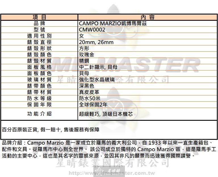 CAMPO MARZIO凱博馬爾茲 CMW0002 女錶以20mm與26mm方形玫瑰金錶殼呈現精緻比例,在搜尋中更容易被找到,適合追求細節的您。 這款女錶雖稱不上華麗奢侈,但玫瑰金精鋼錶殼與貝母面盤的組合,安靜卻有質感。 中二針貝母面板在日常光線下呈現自然亮澤,沒有誇飾,只是盡力把時間顯示得清楚。 強化型水晶玻璃的配置不是最高端,但能穩穩為面盤提供足夠的保護。 深黑色真皮皮革錶帶柔軟服貼,雖不浮誇,卻像是一種踏實的陪伴。 超級輕巧的結構讓佩戴一整天仍然輕鬆,也讓這支錶更適合需要長時間配戴的女性。 頂級日本石英機芯默默運作,不必炫耀,但可靠度足以支撐每一次準時的責任。 防水50米的規格不算極致,卻能安心應對生活裡的水花與偶爾的雨。 全球保固2年雖不是最長,但代表星晴錶業願意為這支錶的品質站出來。 價格或許不是最低,但CAMPO MARZIO CMW0002以務實材質、穩定機芯與細緻外觀,交出一份對品質的責任感。